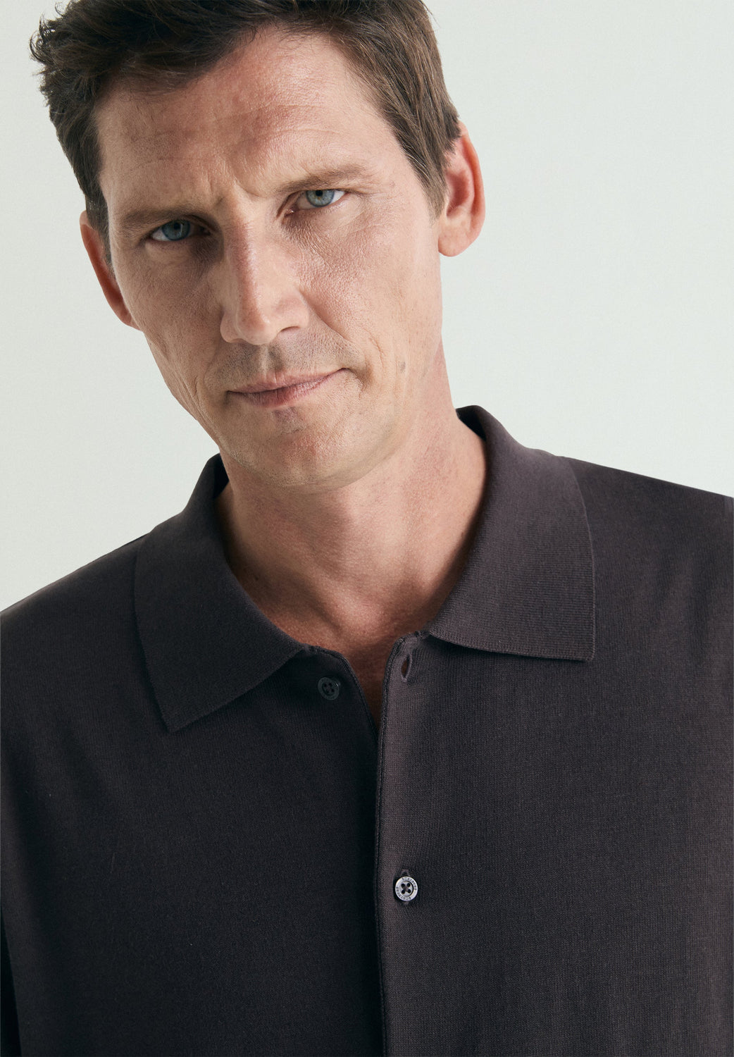 Fine knit polo shirt made of a cotton and silk blend. Polo shirt collar and short sleeves. Front button fastening.