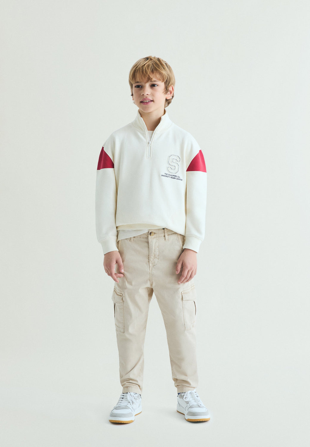 Cargo trousers made of a cotton blend. Slim fit design with front zip and button fastening. Side pockets and cargo pockets with flaps on the legs. Belt loops