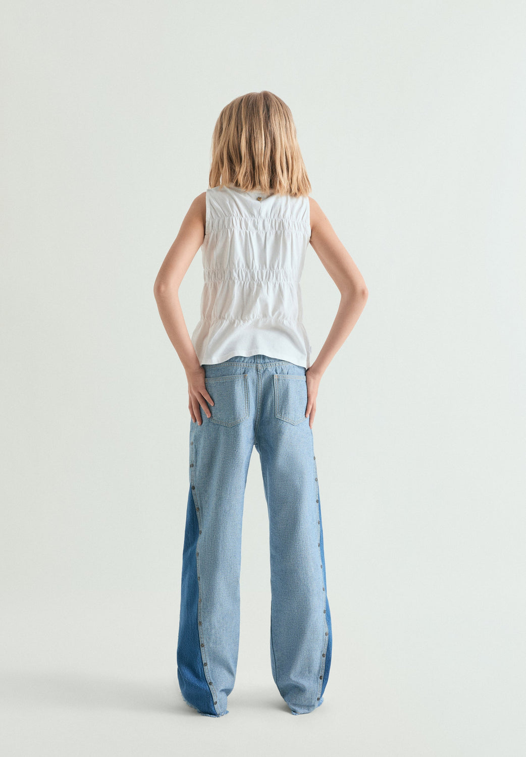 Mid-rise wide leg jeans made of 100% cotton. Contrast two-tone design. Front button and zip fastening. Front and back pockets. Frayed hems. Side slit detail with studs.