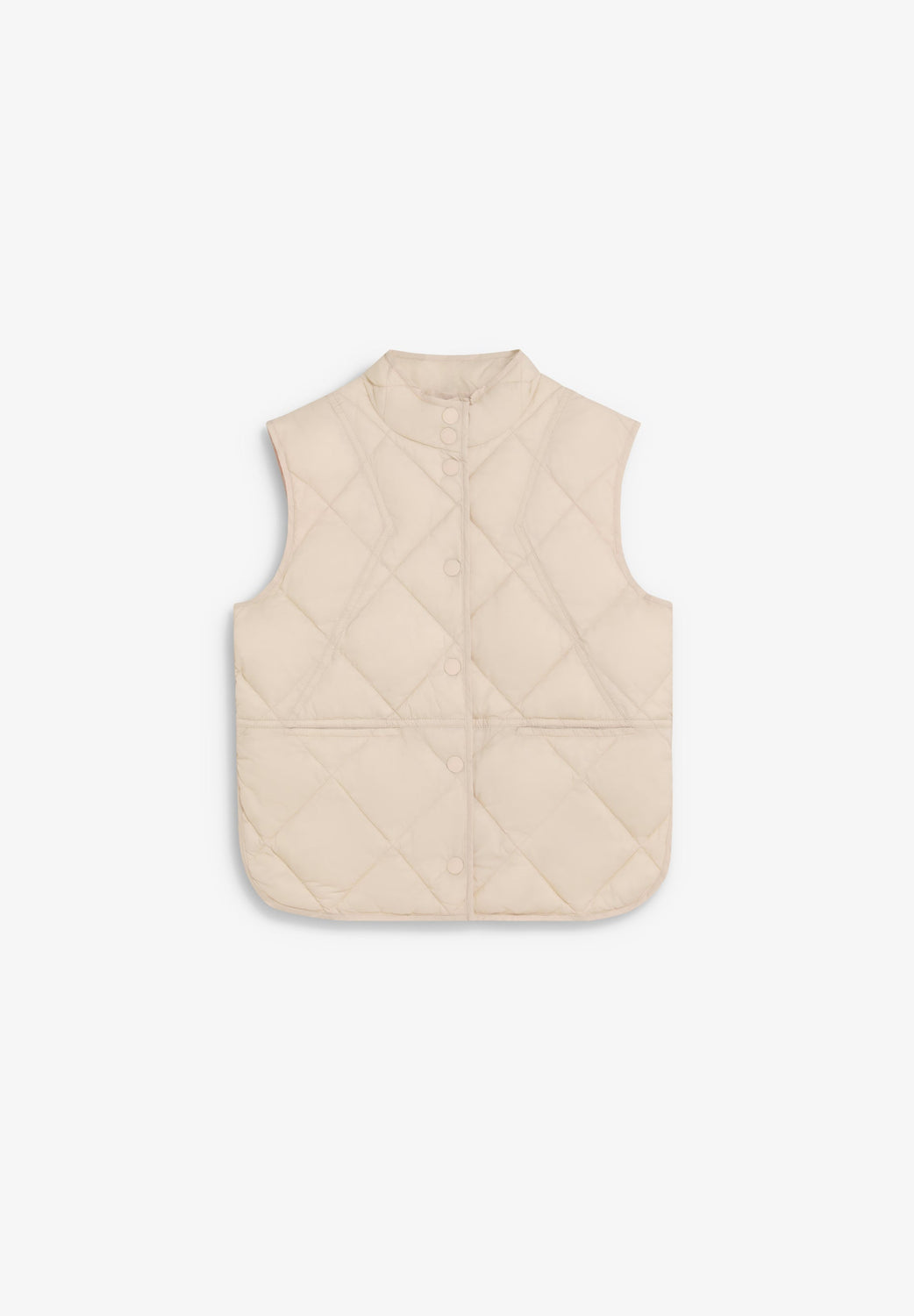 Puffer vest. Rhomboidal pattern stitching. Button fastening. Two front pockets. Rubberised logo detail on the back.