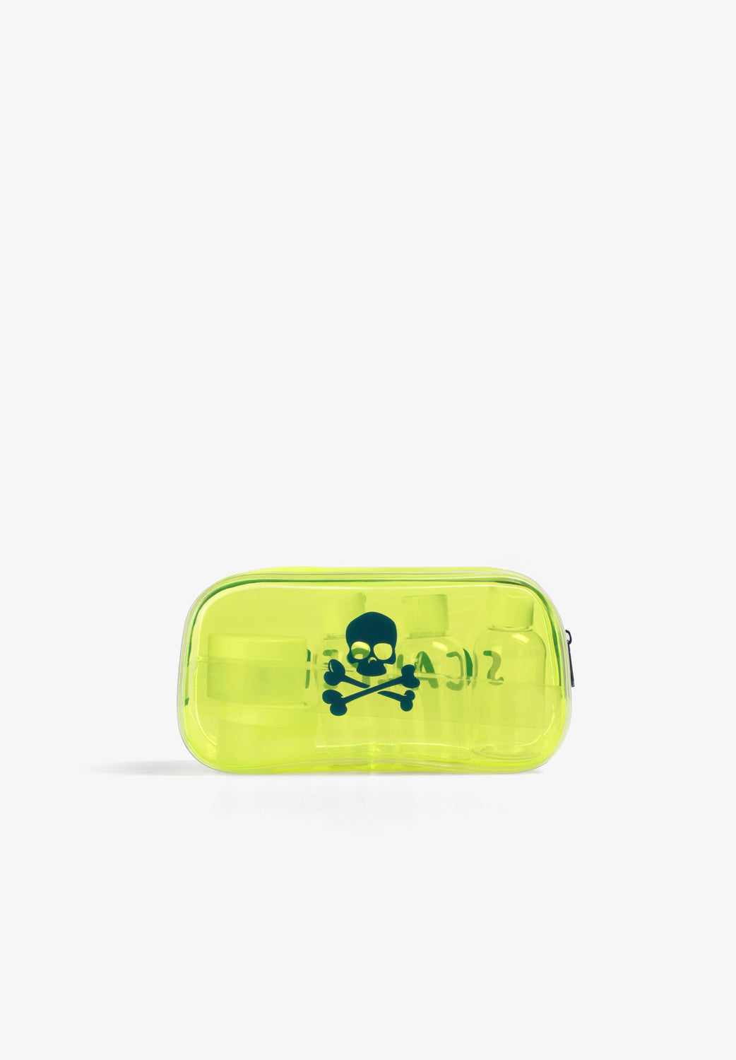 Transparent toiletry bag with zip fastening. Side print with skull and logo. Includes transparent bottles for liquids.