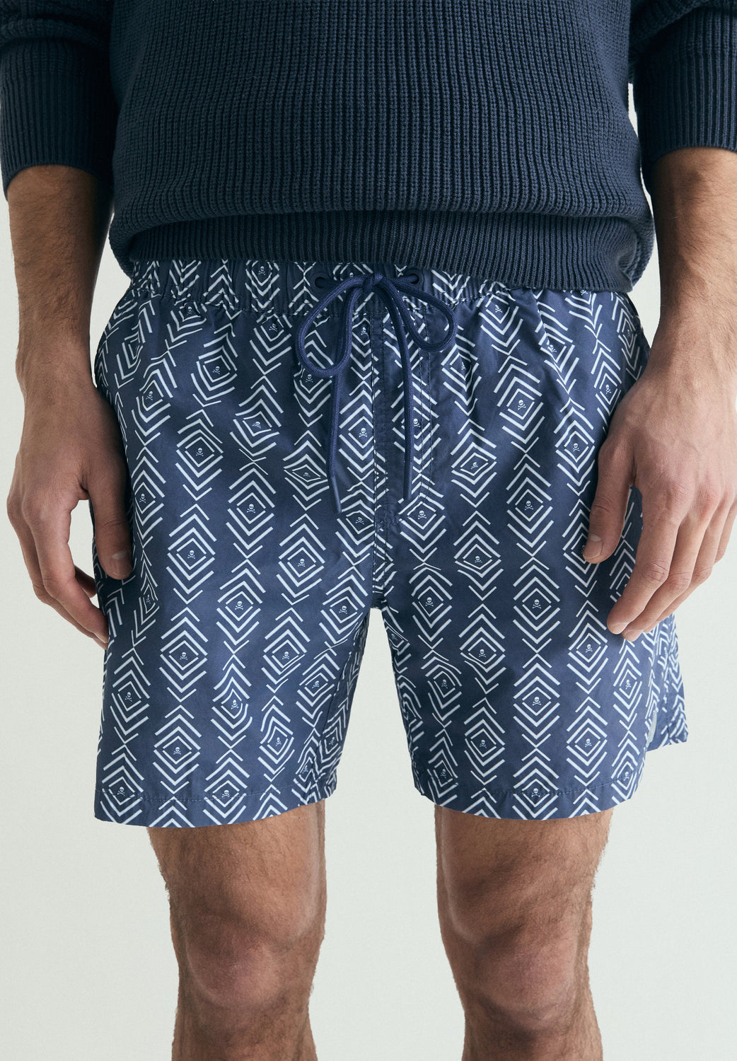 Swimming trunks with elasticated waistband and drawstring. Side pockets. Contrast print. Back pocket. Logo patch detail on the hem.