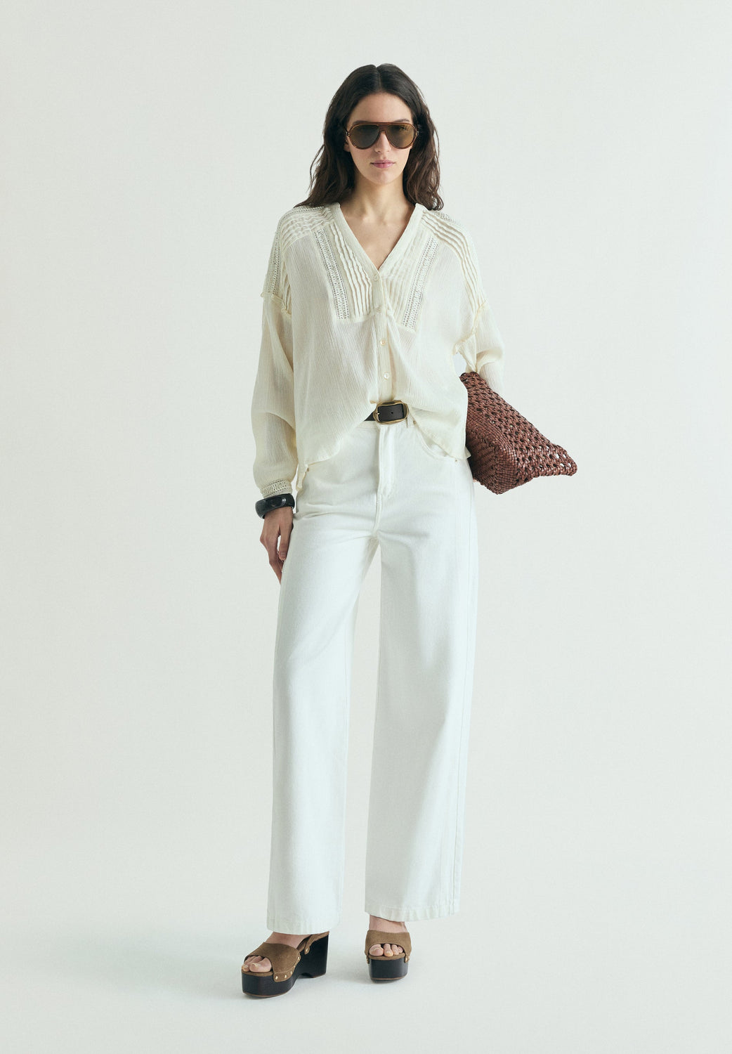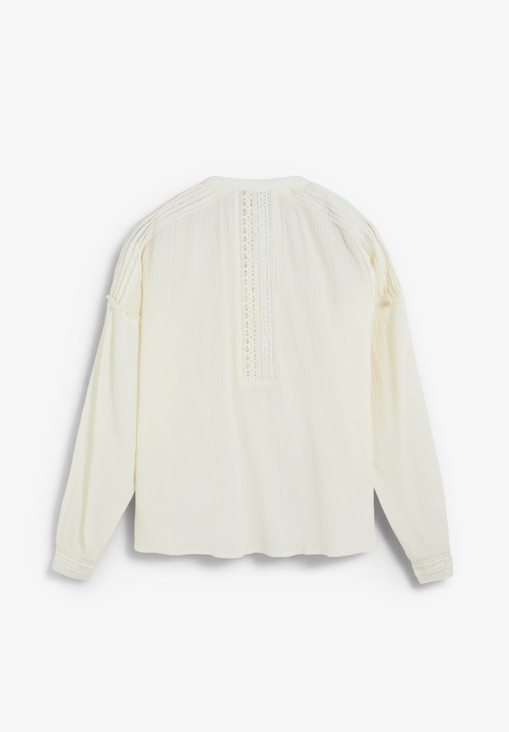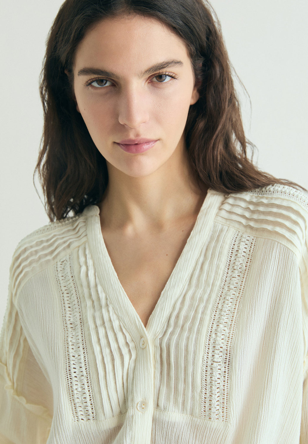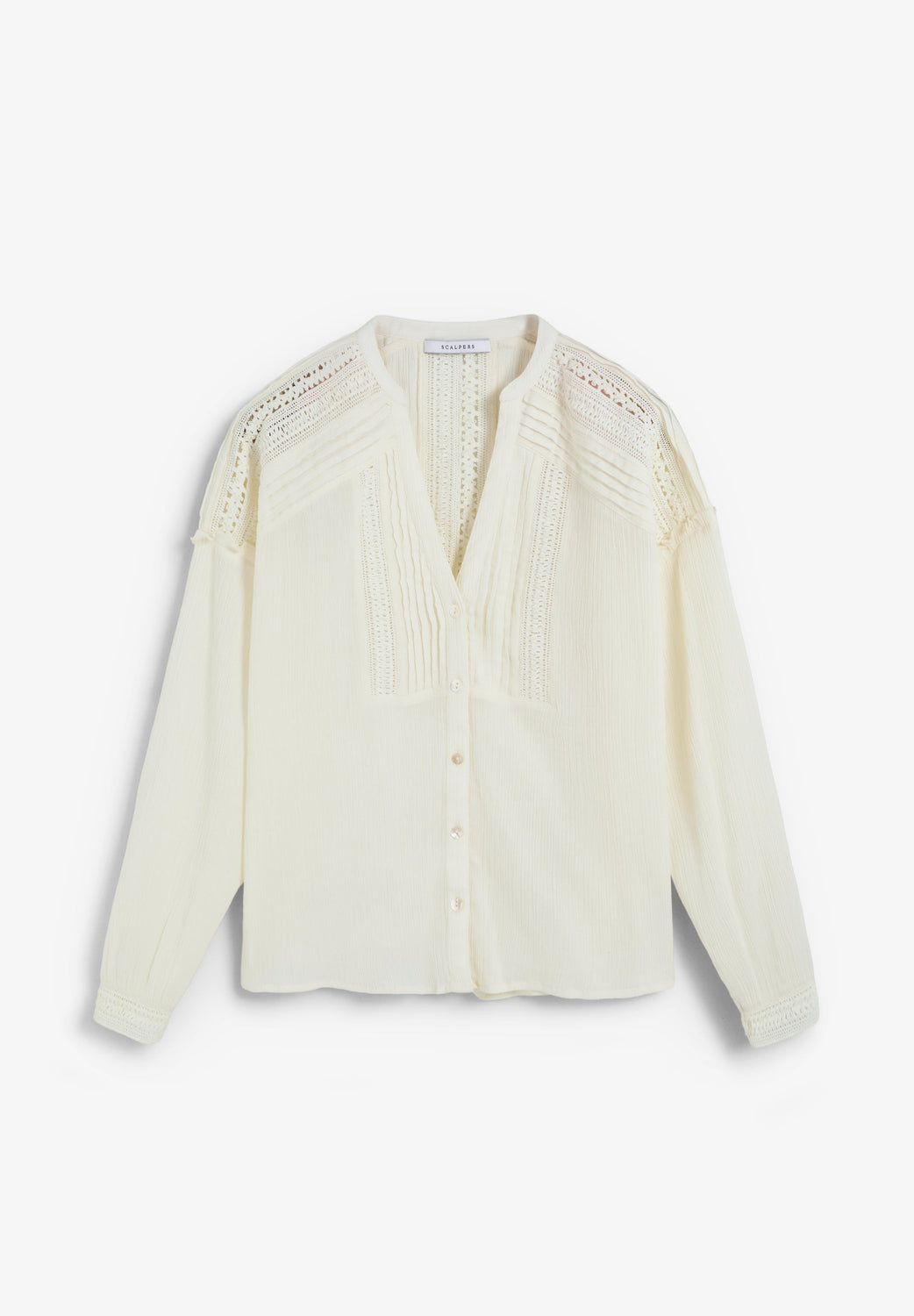 Blouse made of 100% cotton fabric. Relaxed fit Textured semi-sheer fabric. V-neck and long sleeves. Front button fastening. Lace detail on chest, shoulders, back and cuffs.
