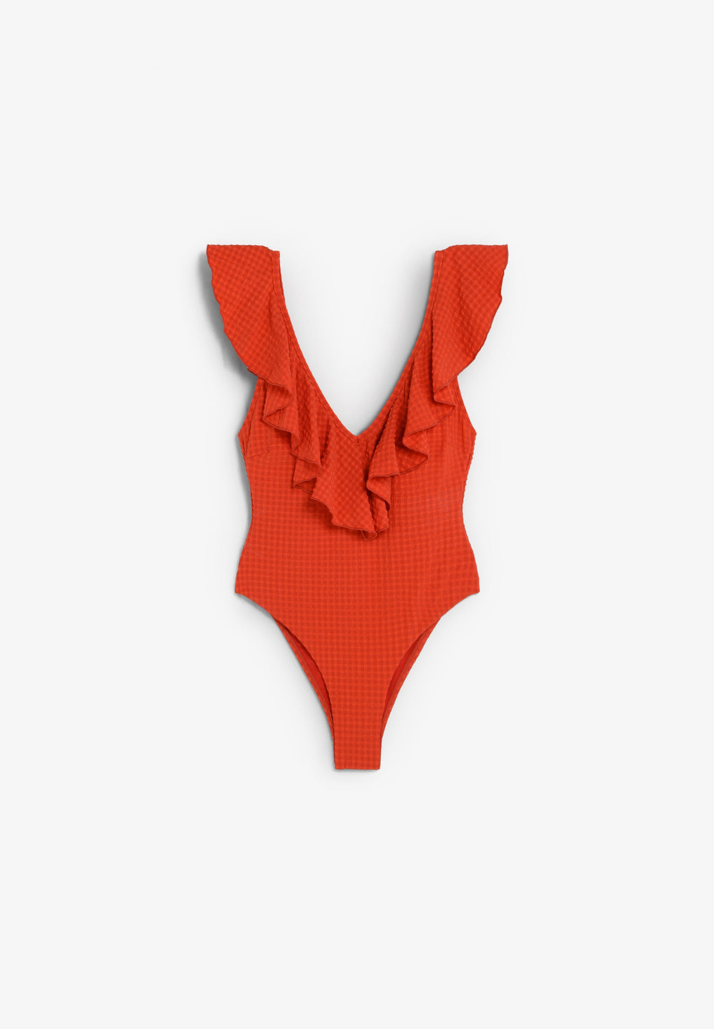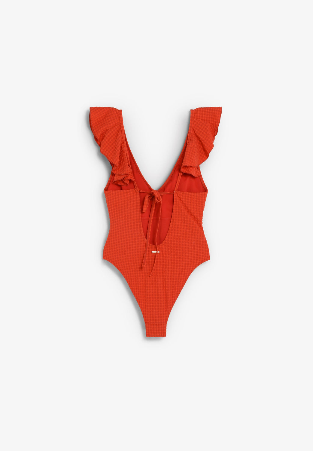 Swimming costume made of textured stretch fabric with vichy checks. Lined. V-neck with ruffle. Back closure with lacing and open back.