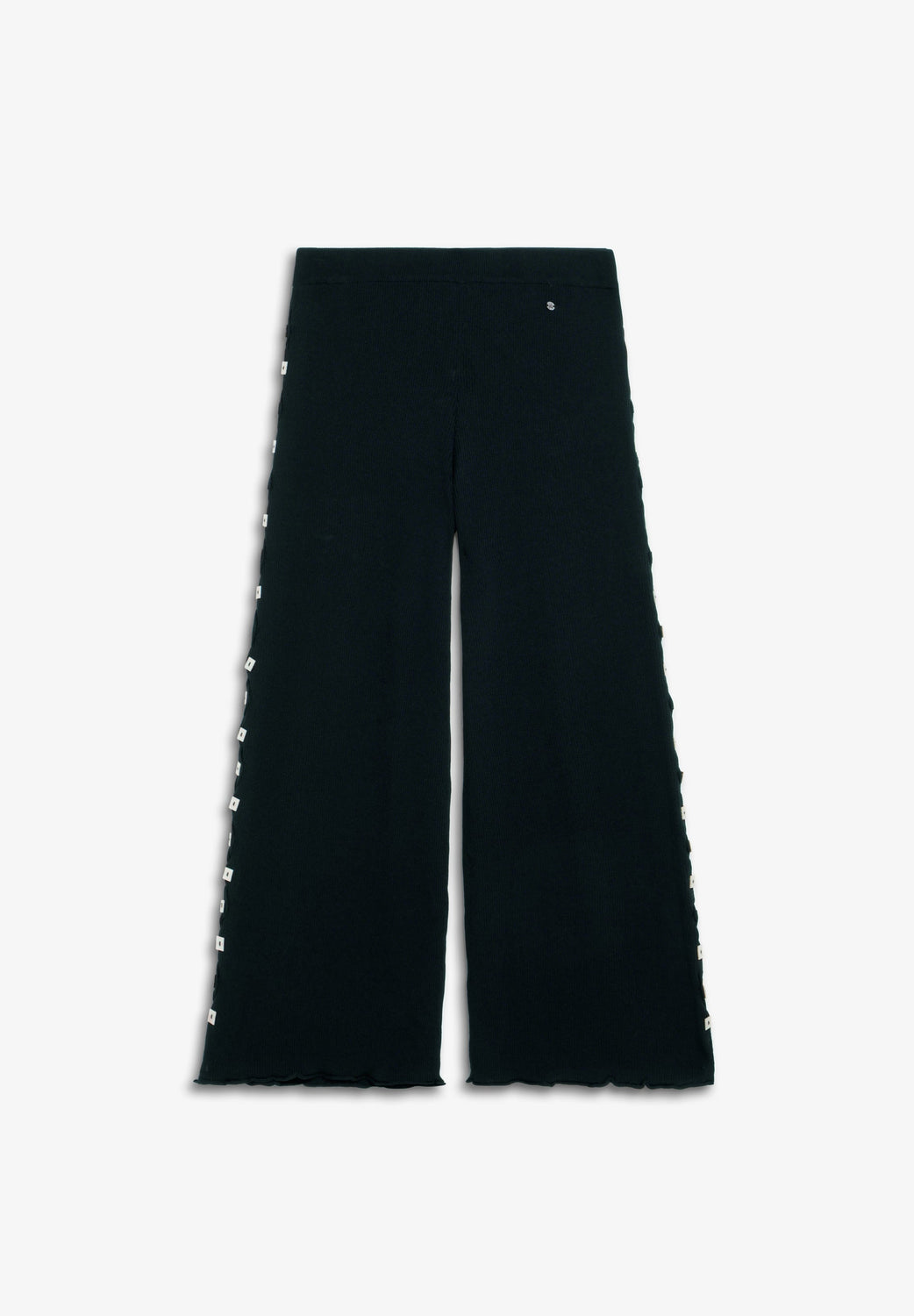 Trousers in soft ribbed knit fabric. Fluid drop. Mid-rise. Straight fit with wide leg. Incorporate decorative side appliqués integrated into the seam. Straight hem with a slight natural undulation of the fabric.