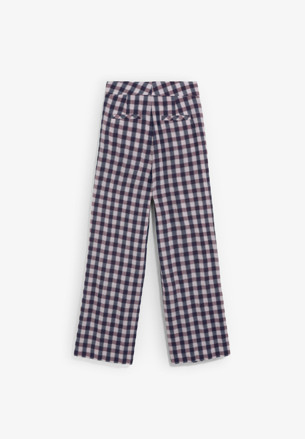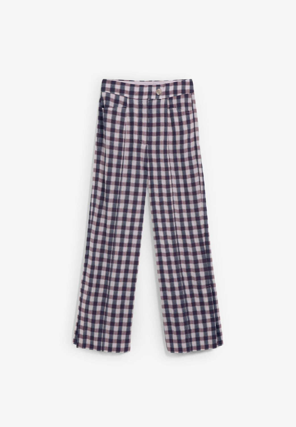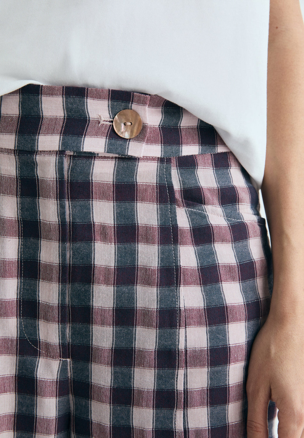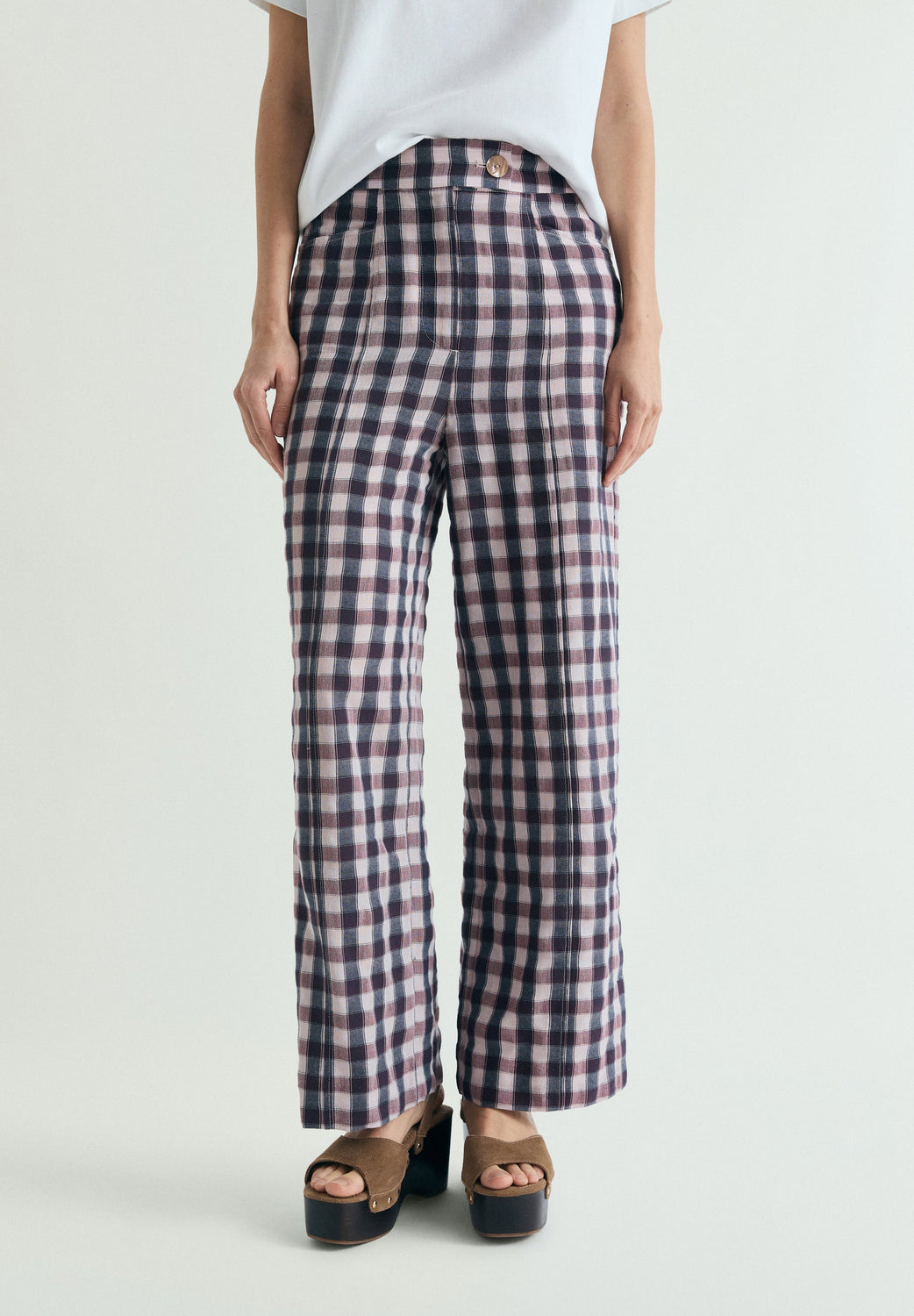 Trousers made of flowing fabric with metallic thread. Regular fit. Gingham print. Side pockets and back welt pockets. Zip and slightly offset button fastening.
