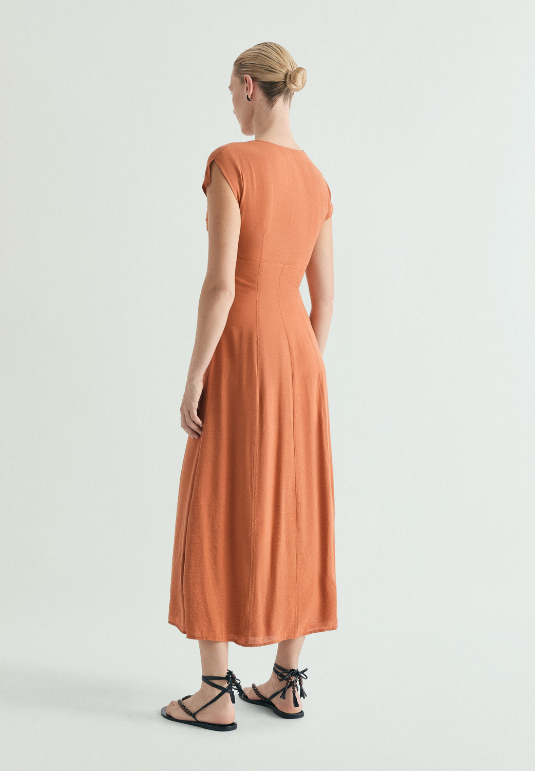 Bustier dress made of slightly stretchy cotton. Slim fit, V-neck. Pleated detail on the chest. Short sleeve. Midi length. Concealed side zip fastening.