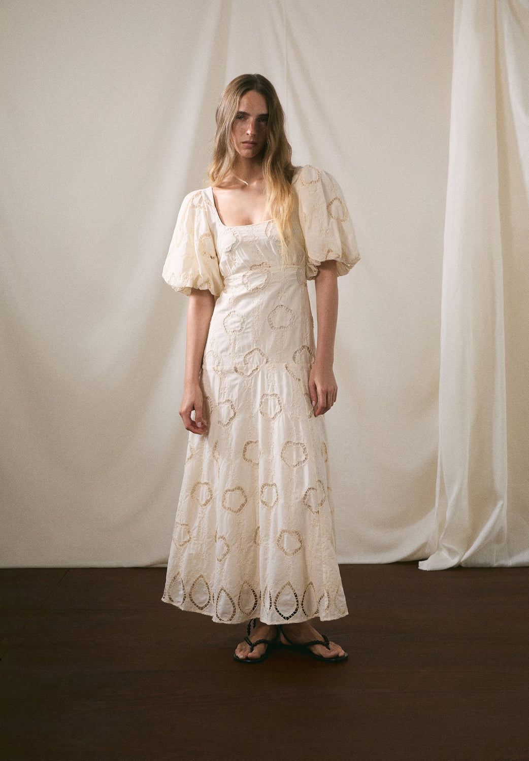 Dress made of openwork fabric with tonal embroidery. Midi length, regular fit. Square-cut neckline and short puff sleeves. Fitted bodice and wide-drop skirt. Elasticated ruching at the back. Invisible side zip fastening.