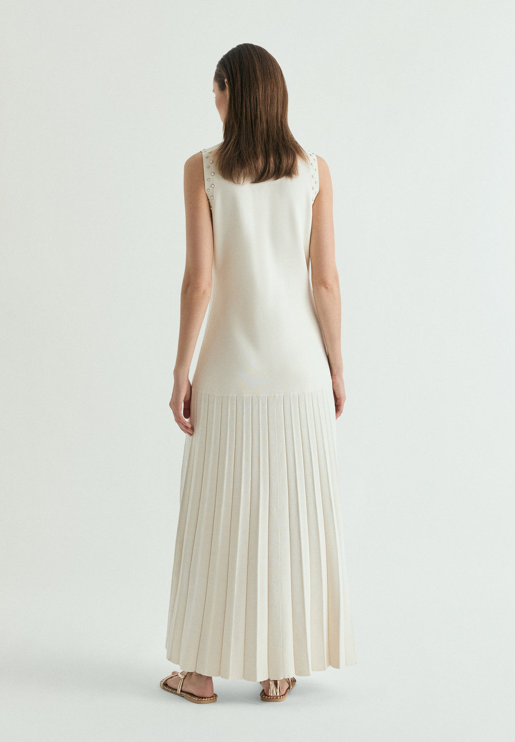 Knit mini dress. Straight, slim fit. Round neck and sleeveless design. Studded detail. Flowing pleated skirt.