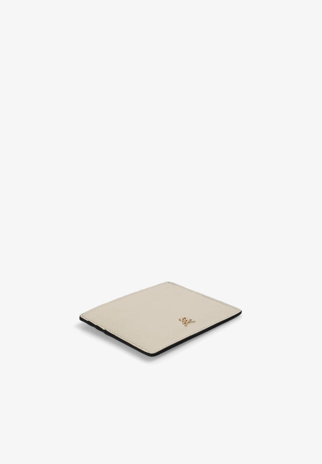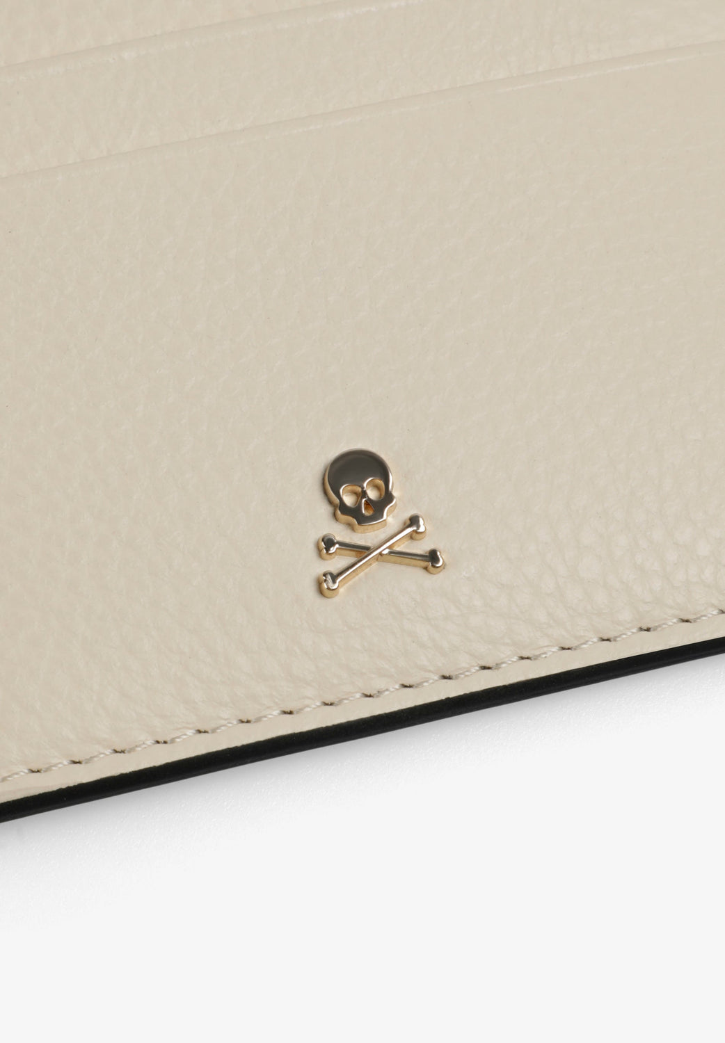 Card holder made of leather with metal skull detail.