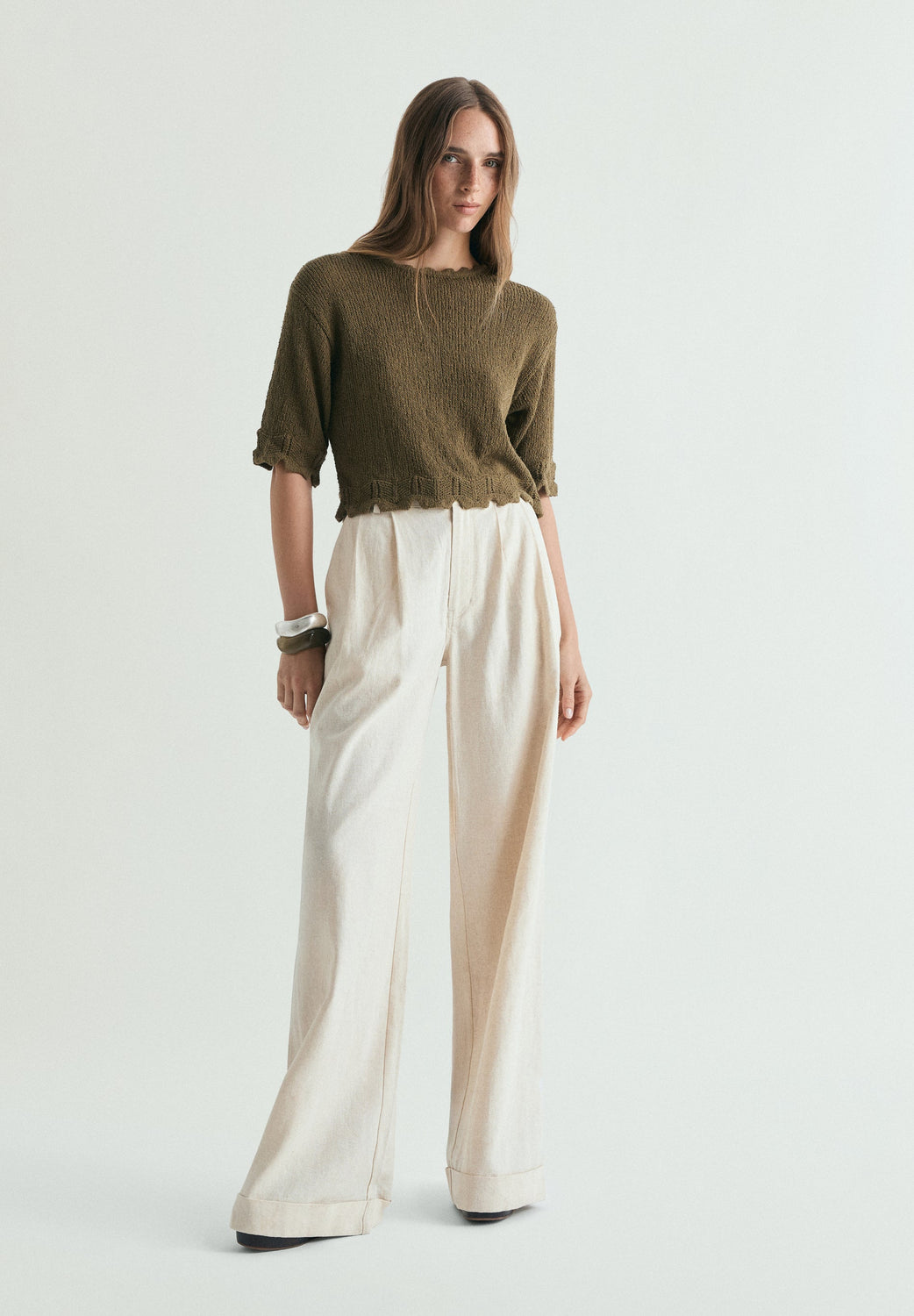 Sweater made of 100% cotton. Cropped, regular fit. Round neck and short sleeves. Openwork detail and wavy detailing on sleeves and hem.
