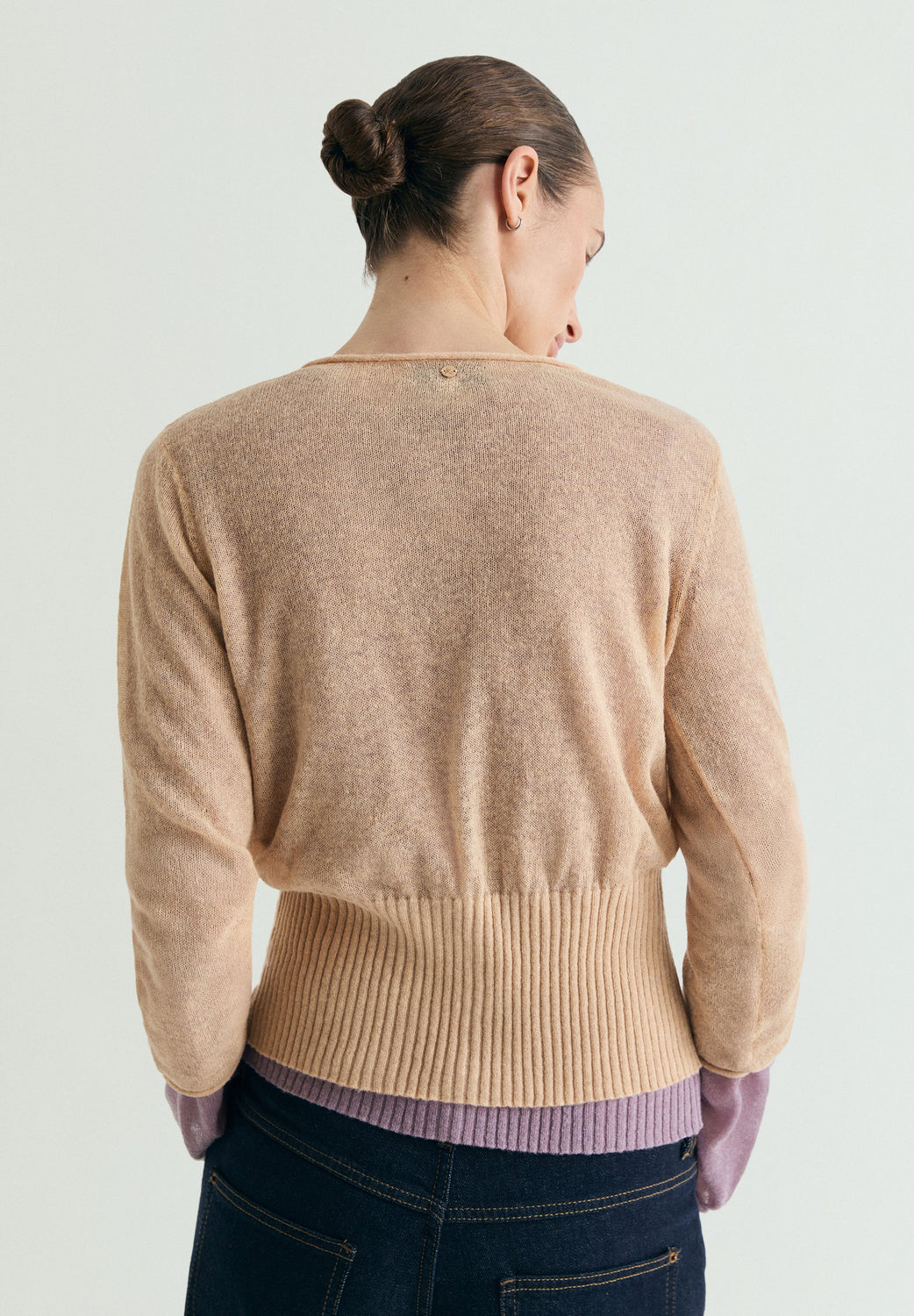 Cardigan made of a wool blend. Tie detail at the neck. Long sleeves. Fitted waist with ribbing. Front button fastening.