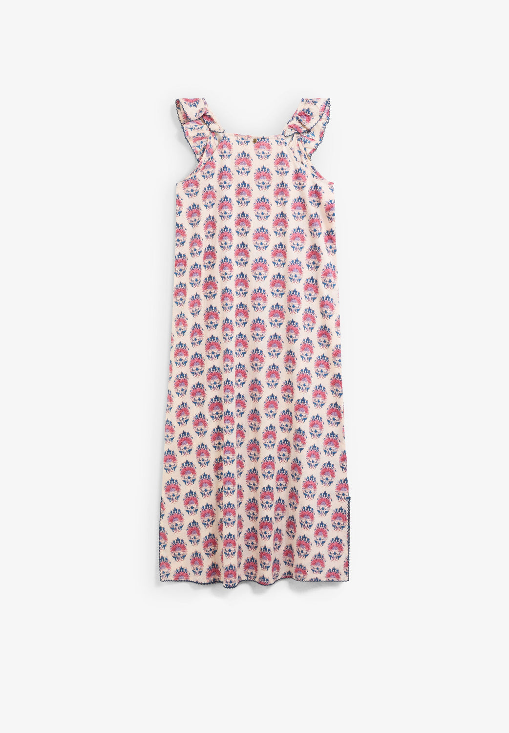Dress made of 100% cotton. Midi length, relaxed fit. Round neckline with ruffle and straps. Printed fabric.