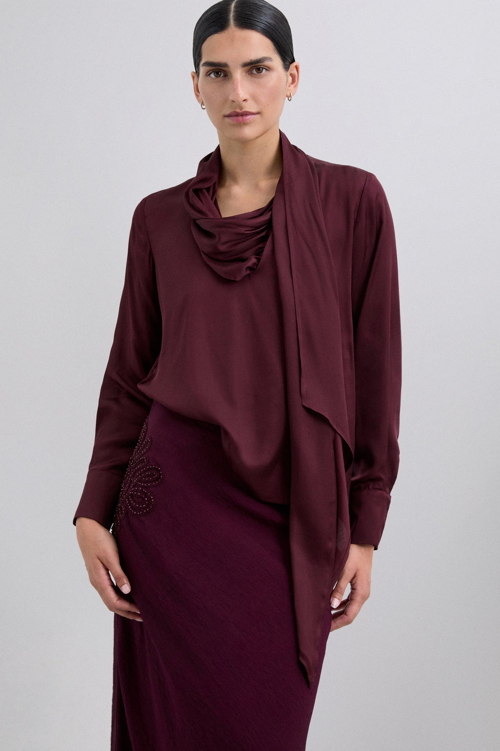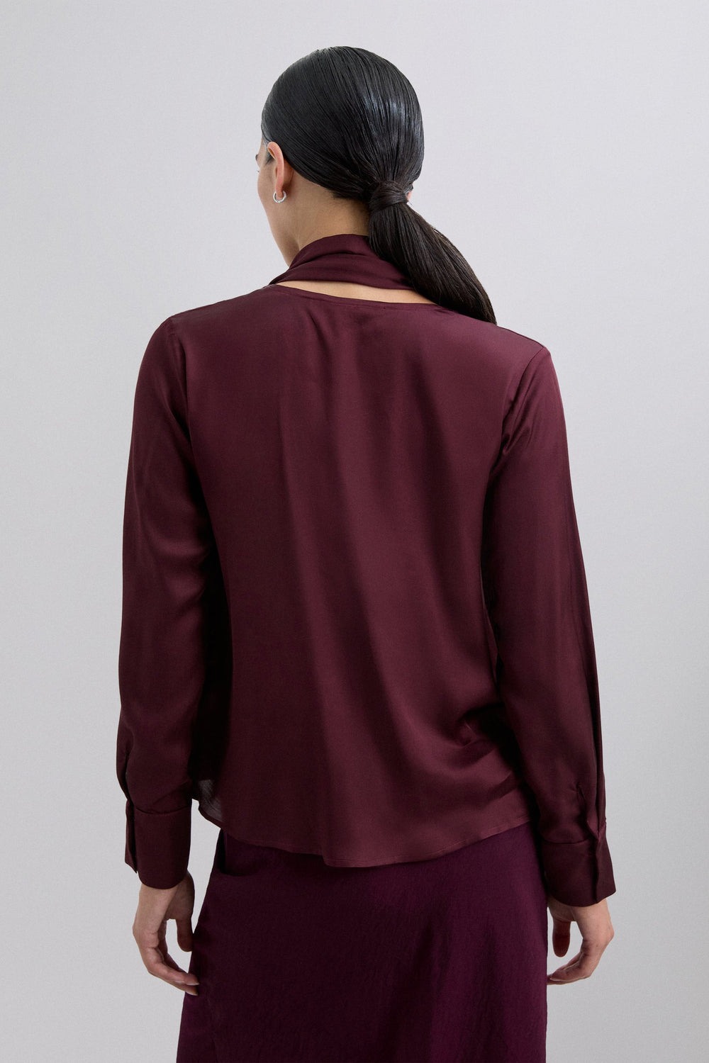 Satin blouse with long sleeves. Draped collar and adjustable bow.