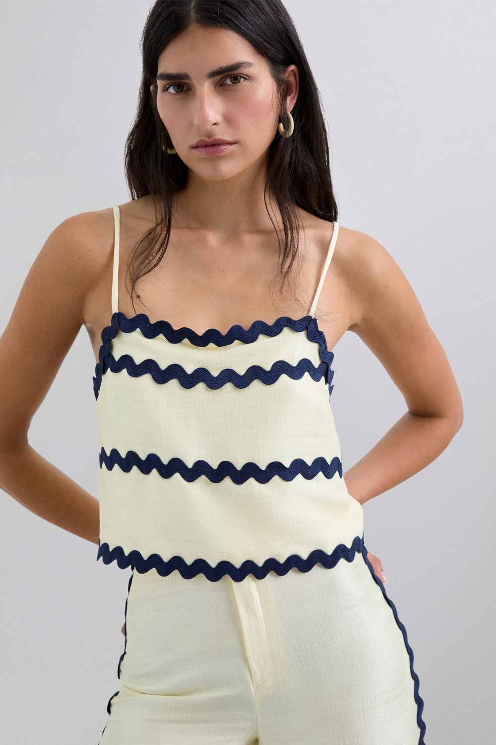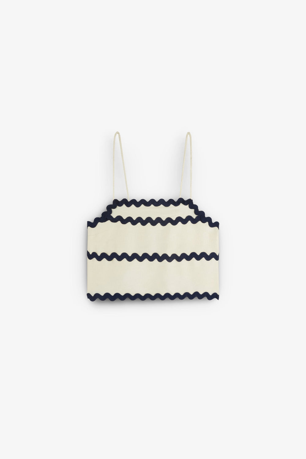Top with thin straps and straight neckline. Contrast scalloped detail on pocket. Cropped.