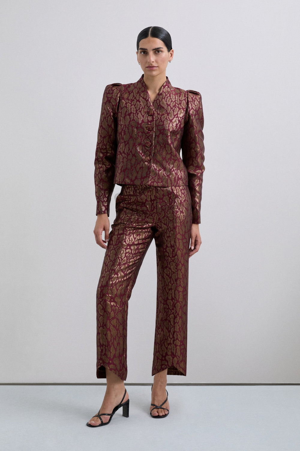 Cropped blazer in metallic-effect fabric with animal print. Slightly high collar. Long balloon sleeves with pleating at the shoulders. Fitted design with button fastening.