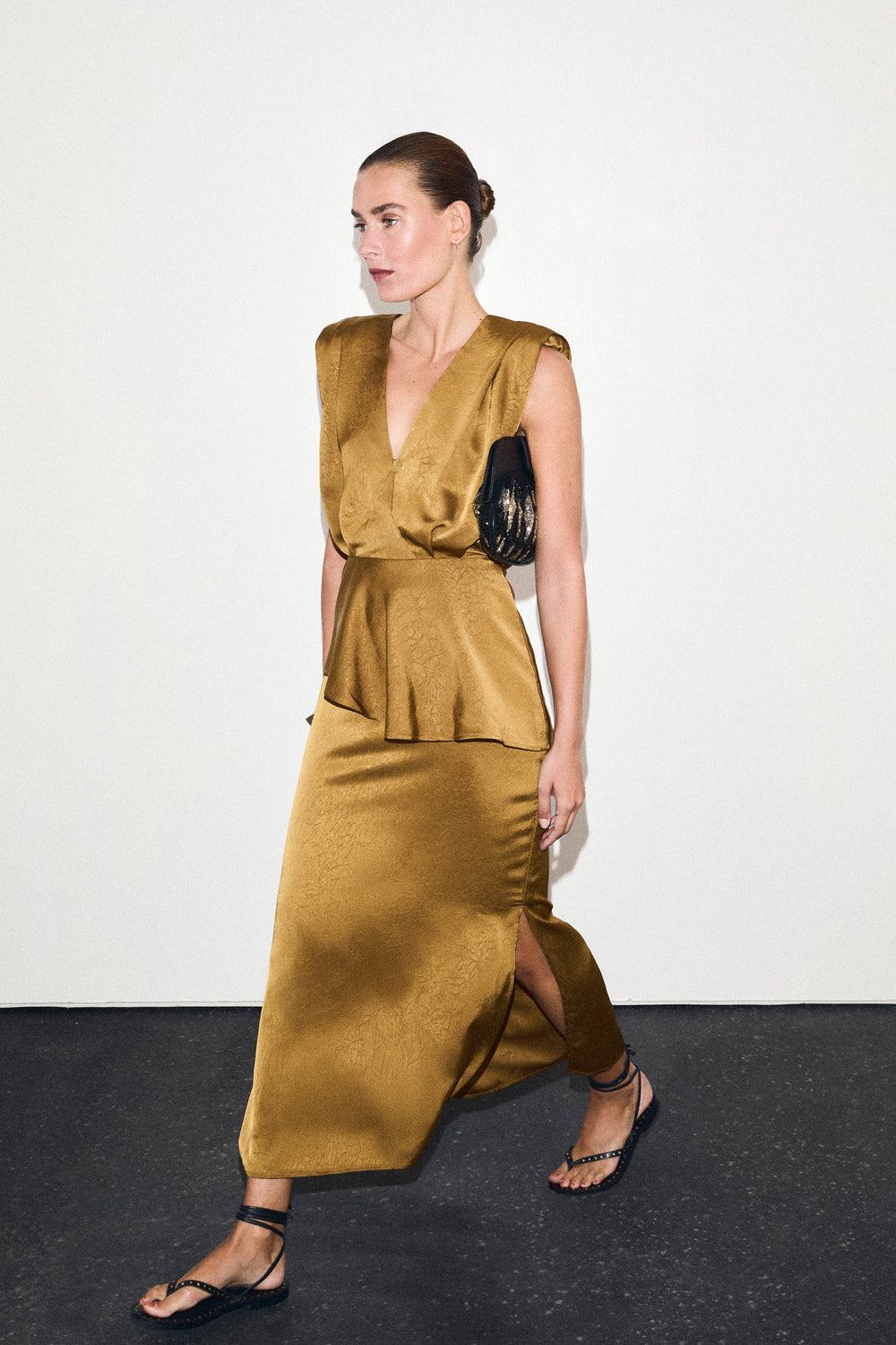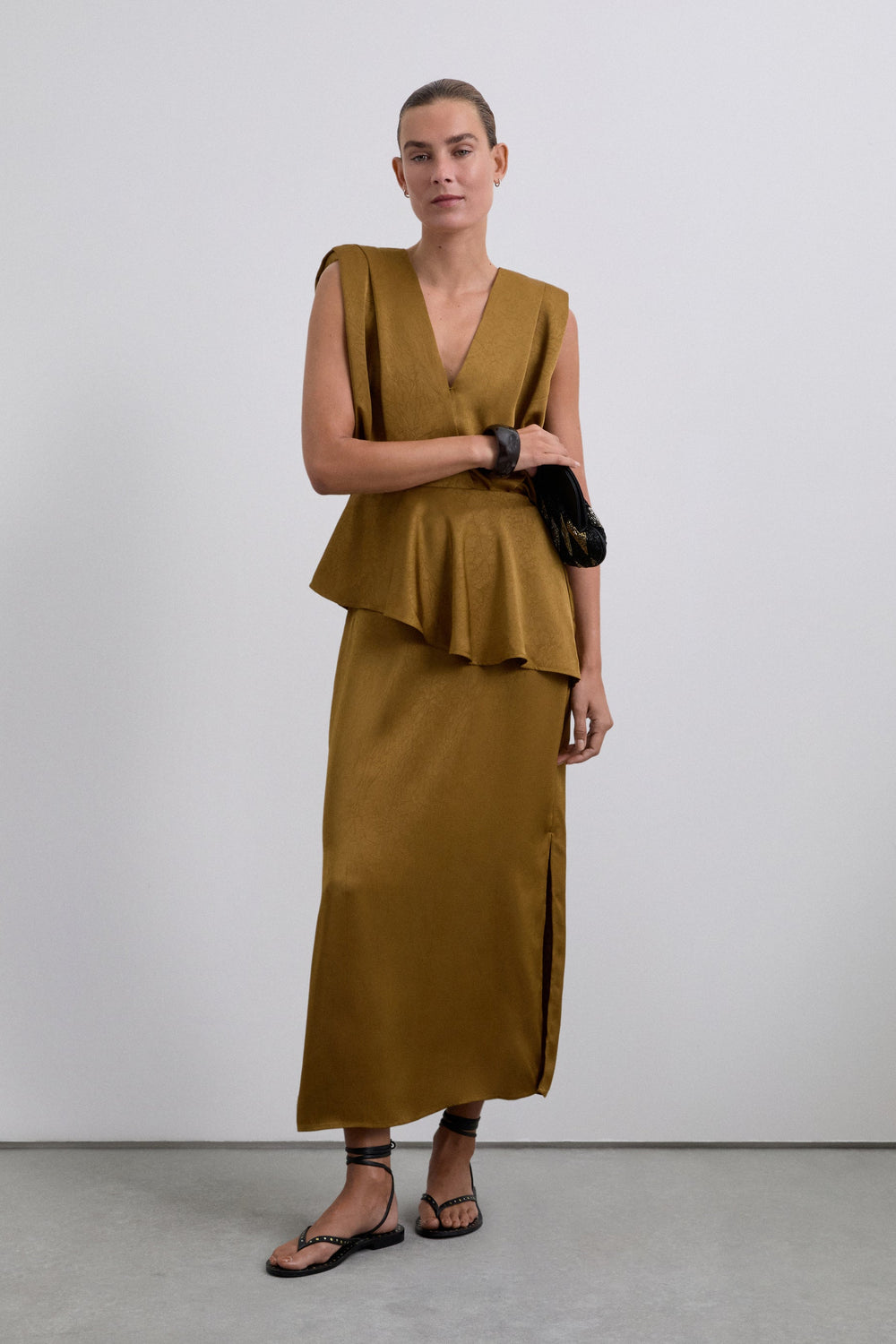 Midi skirt made of flowing fabric with texture. Concealed side zip fastening and split leg.