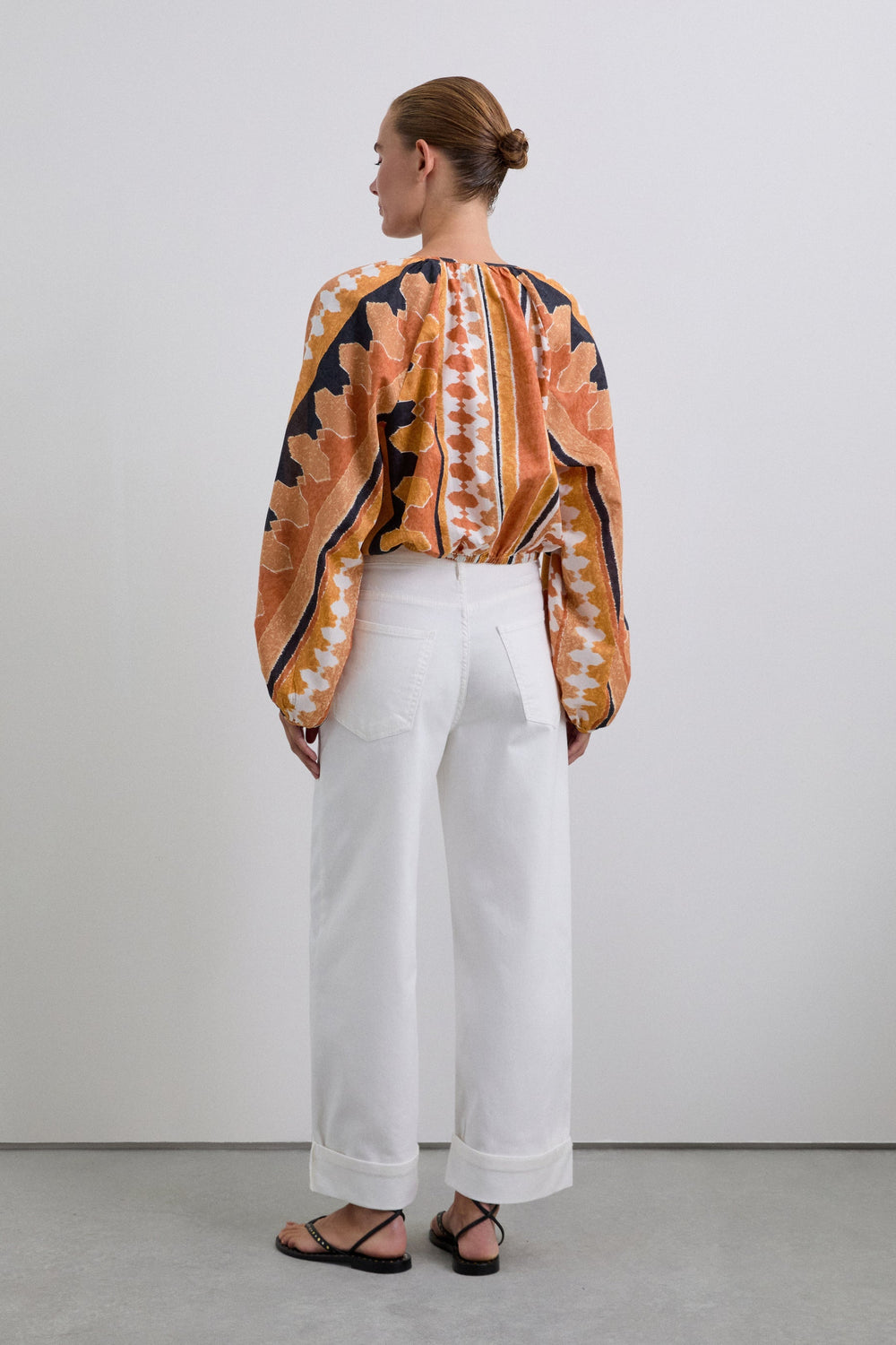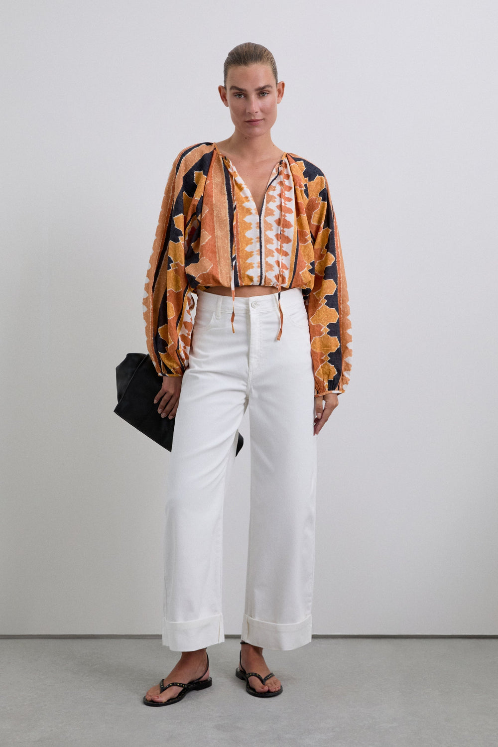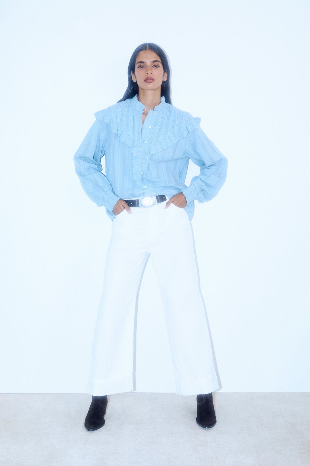 Mid-rise denim culottes. Relaxed fit. Pleat at the bottom. Front and back pockets. Button fastening and belt loops. Logo label detail at the back.