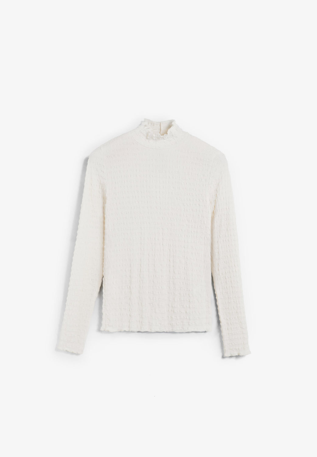 High neck top with long sleeves. Lightweight fabric with gathered texture.