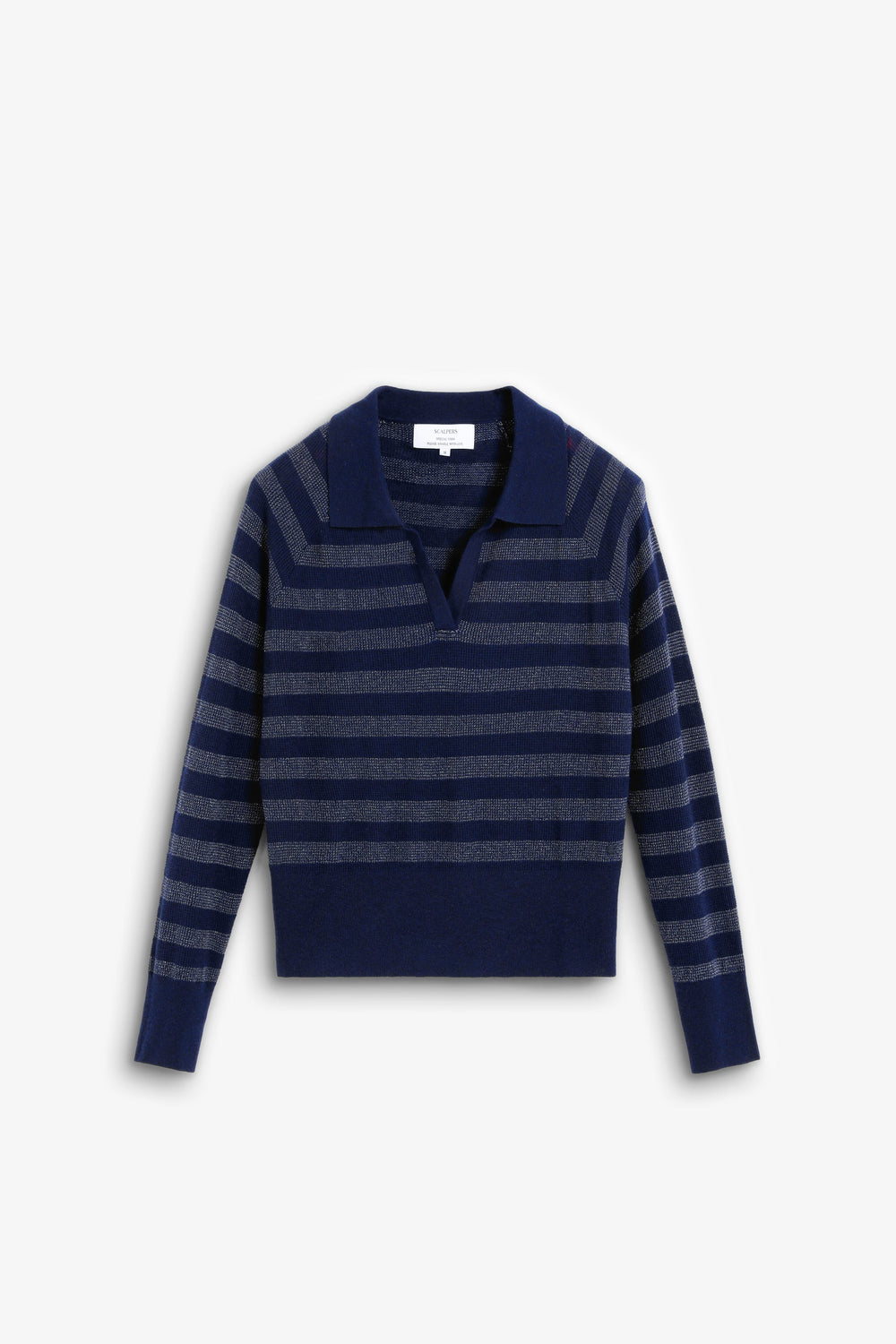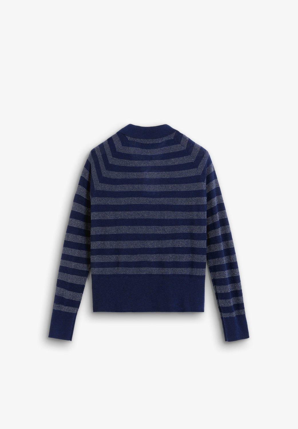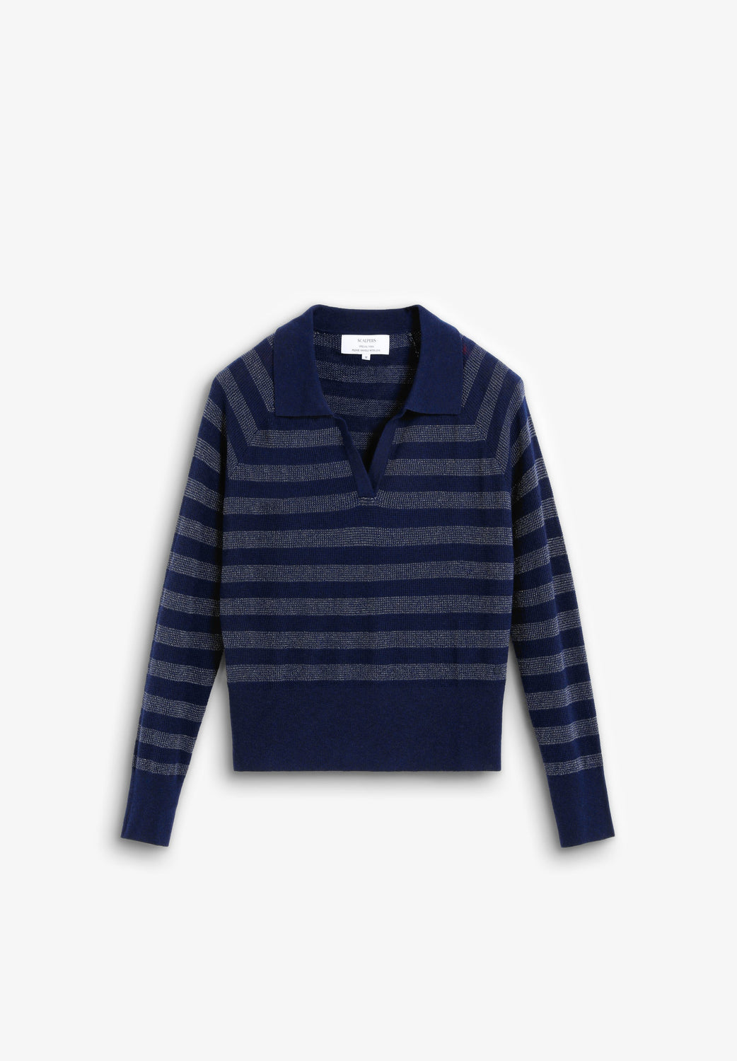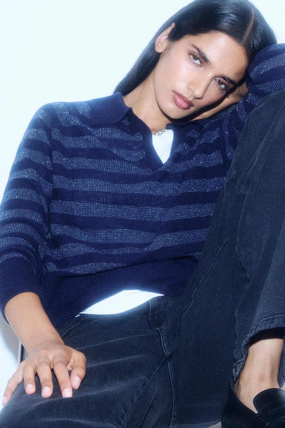 Polo shirt-style sweater made of a wool blend. Regular fit. Striped print with metallic thread. Polo shirt collar. Long sleeves with ribbed cuffs.
