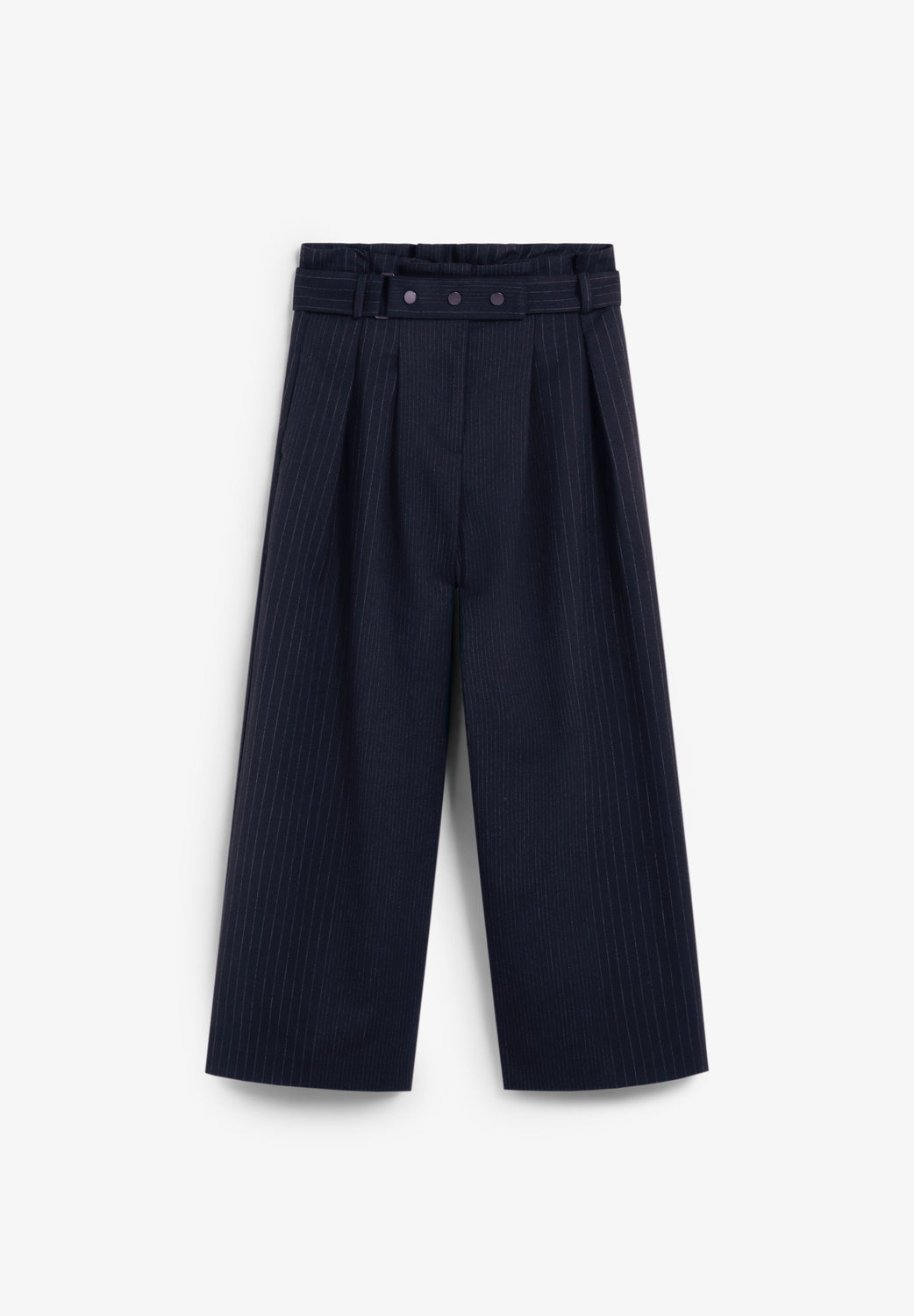 Culottes. High cut. Belt loops at the waist. Zip fastening concealed by a flap, with hook and eye and button. Two side pockets.
