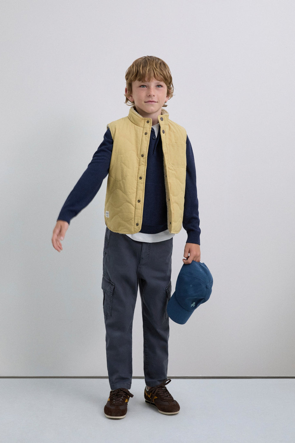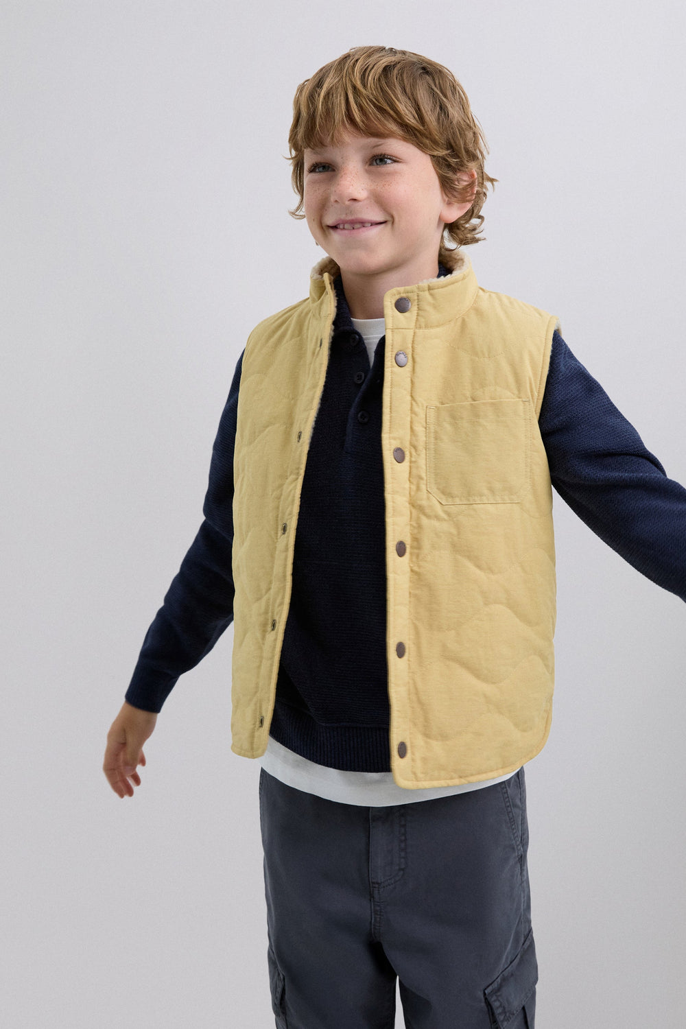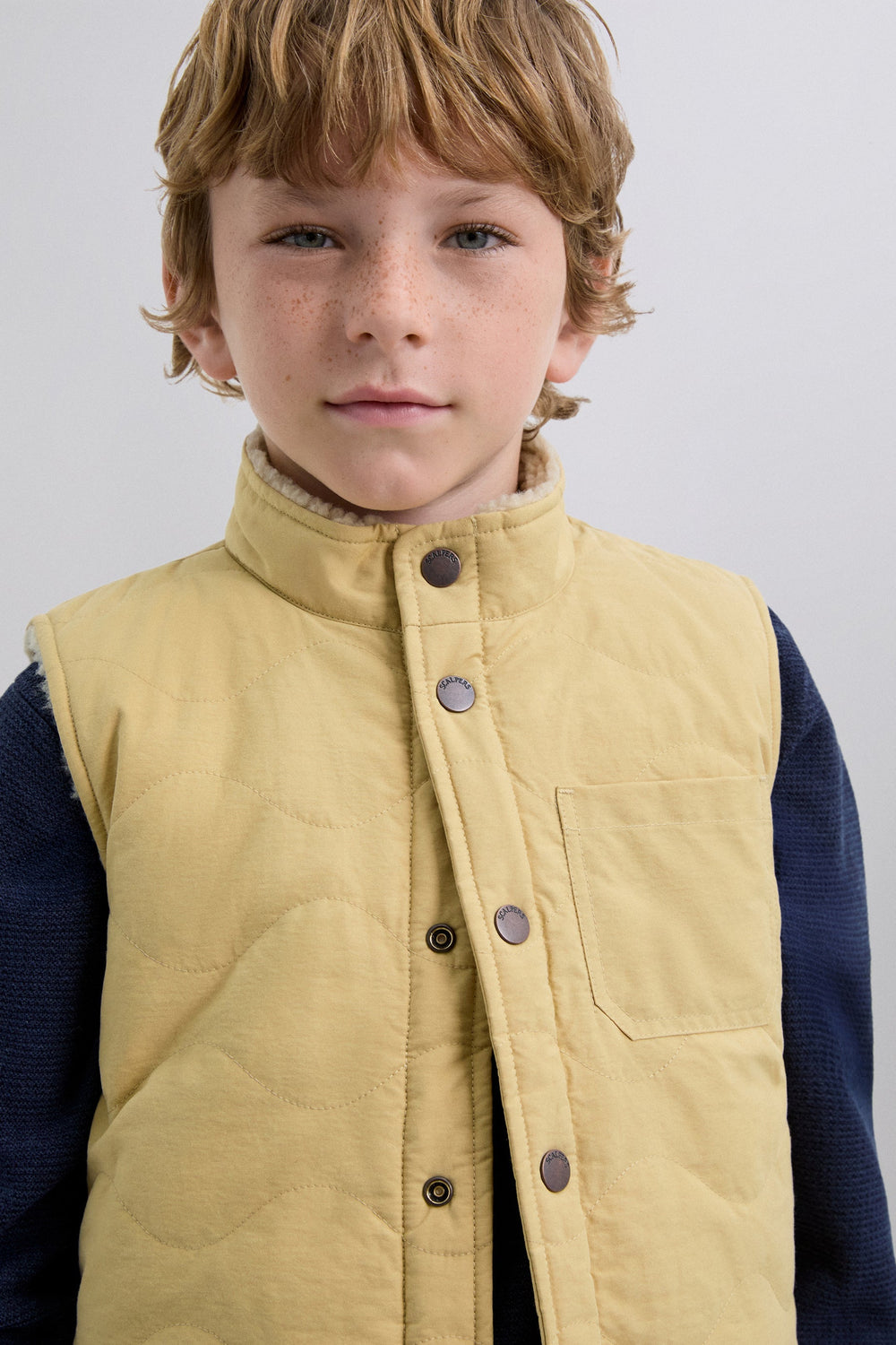 Puffer gilet made of cotton and nylon blend with outer pocket. Shearling lining made from recycled material. High collar. Regular fit. Button fastening.
