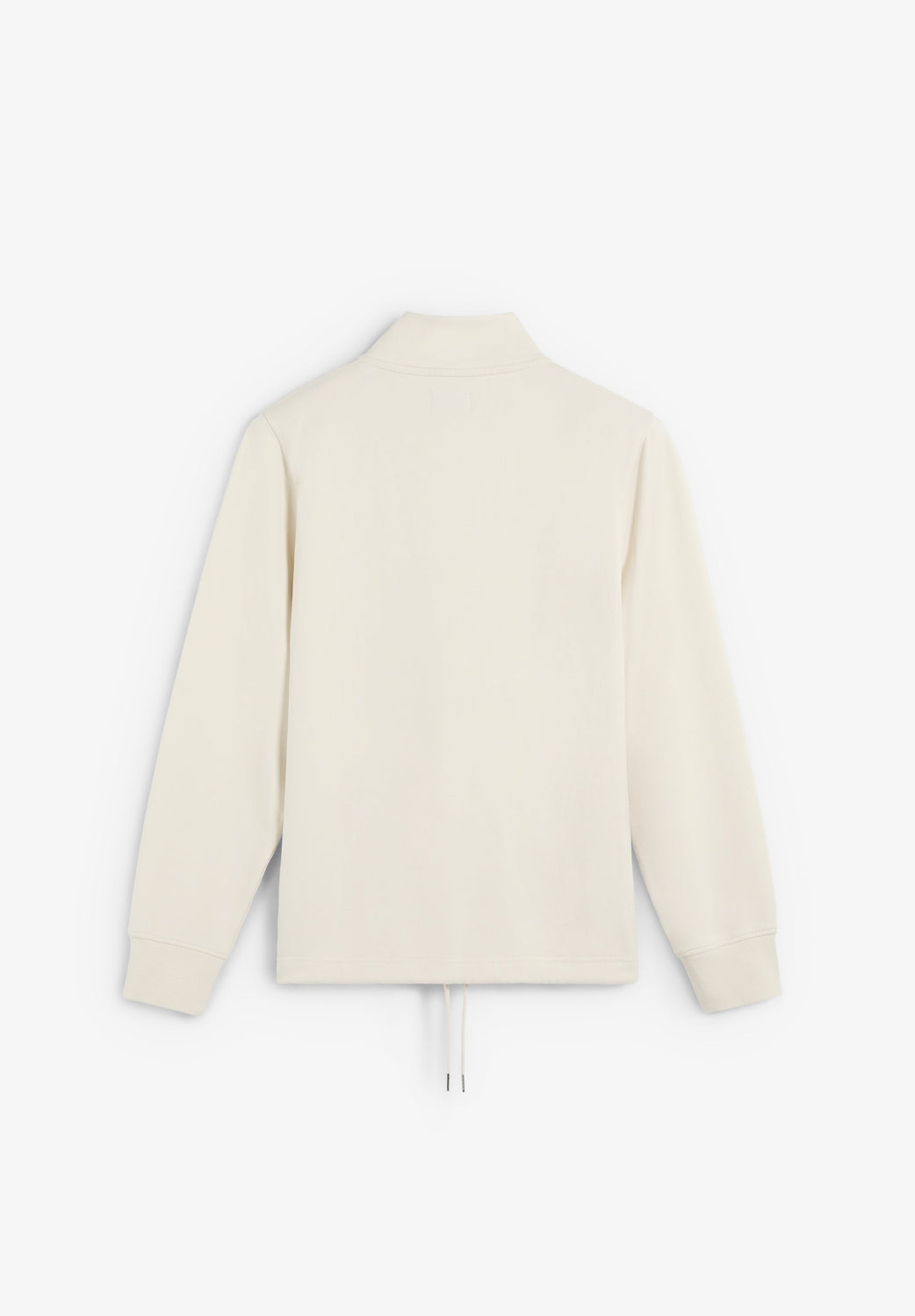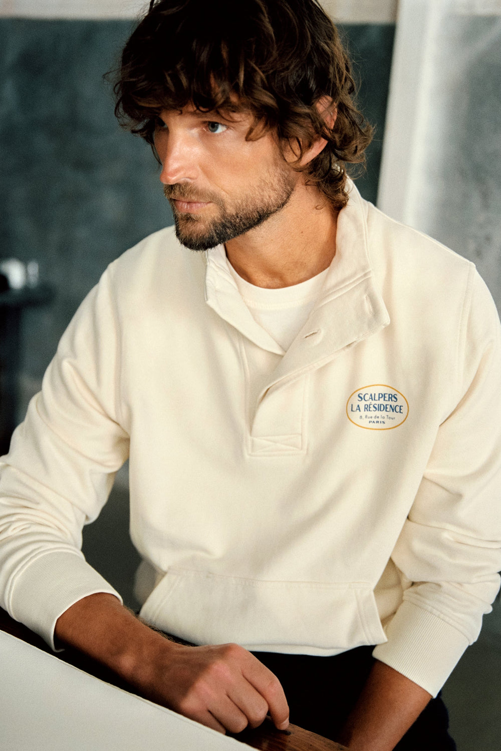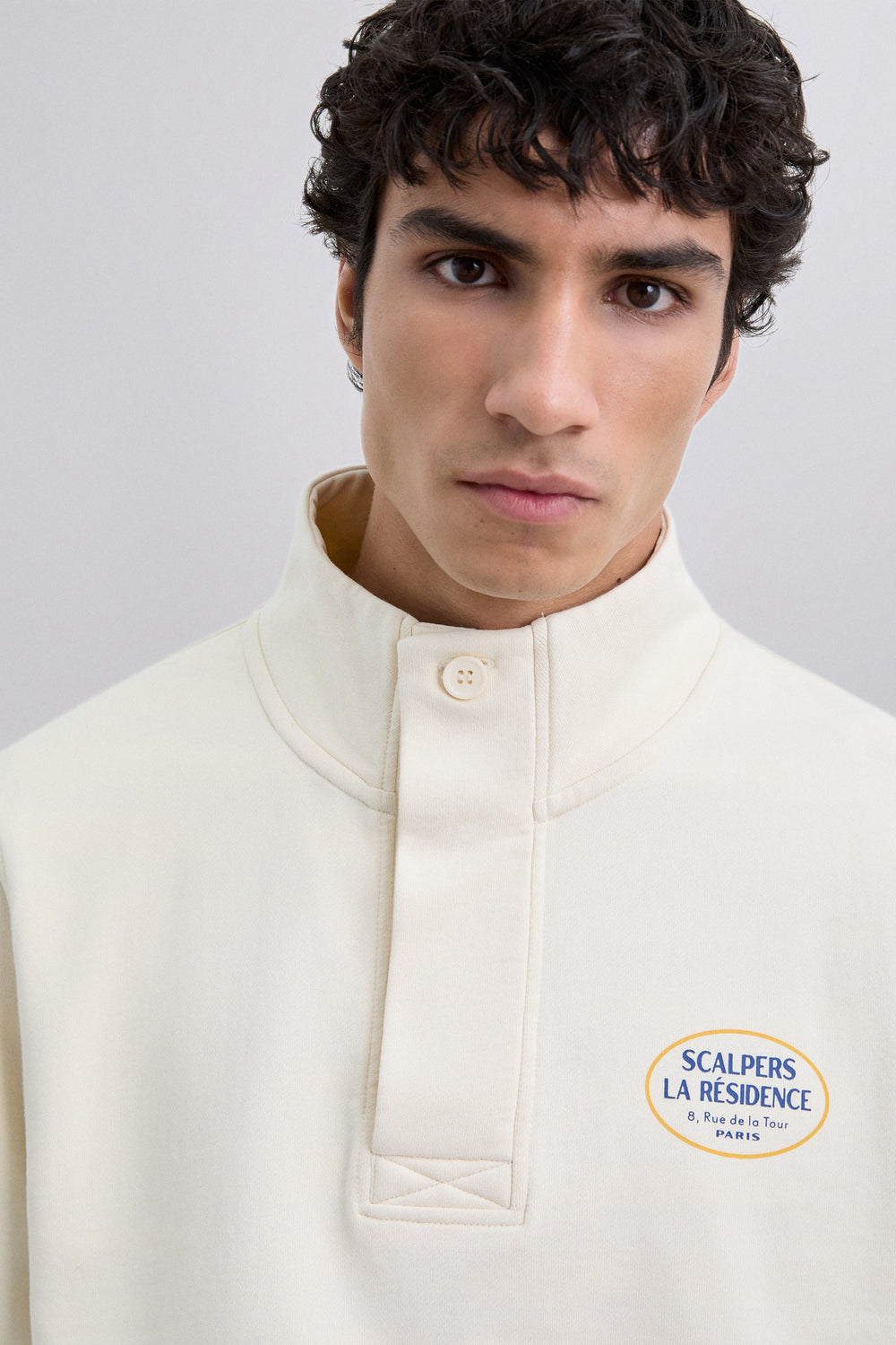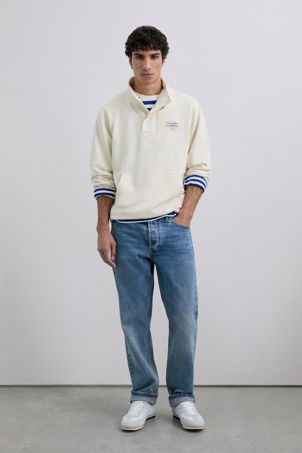 Sweatshirt made of 100% BCI cotton. Long sleeves. High collar and button fastening. Print logo on the chest. Pouch pocket on the front. Adjustable fastening with drawstring at the waist.