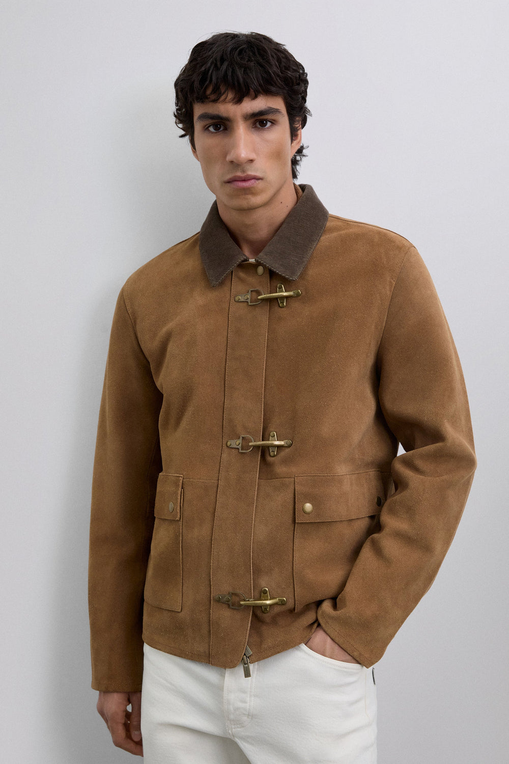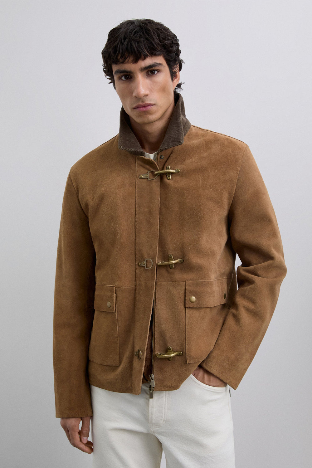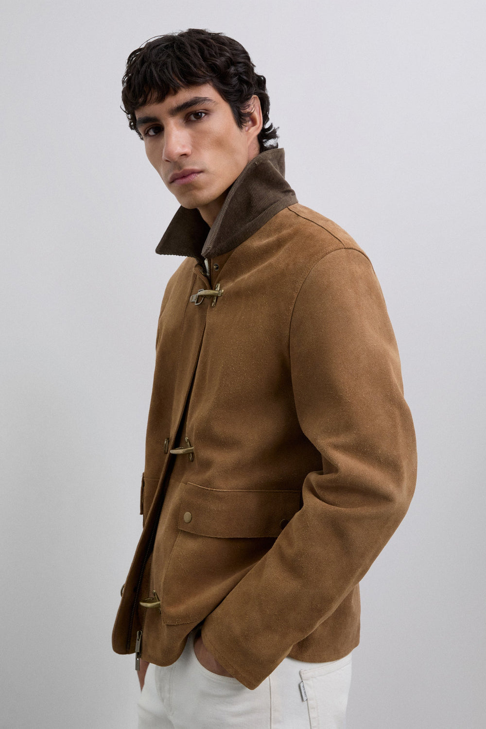 Jacket made of 100% leather. Long sleeves. Corduroy collar. Metal toggle and zip fastening at front. Two buttoned patch pockets.