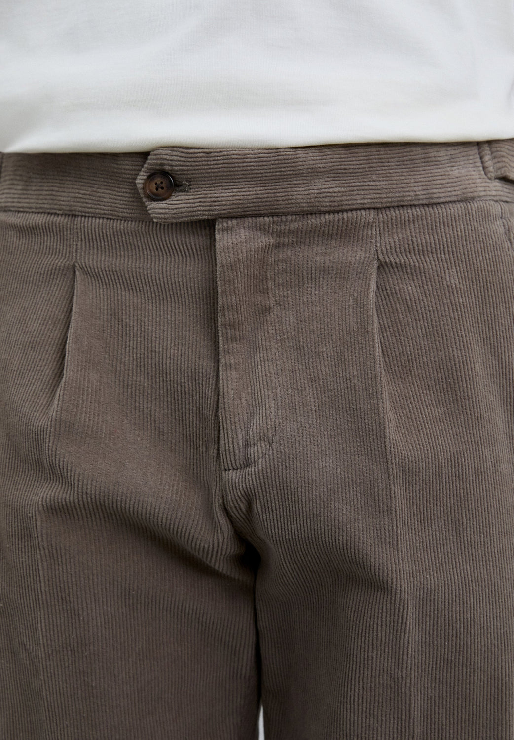 Darted corduroy trousers made of BCI cotton. Slim fit. Metal adjusters on the sides of the waistband; button and zip fastening. Two front pockets and two buttoned back pockets.