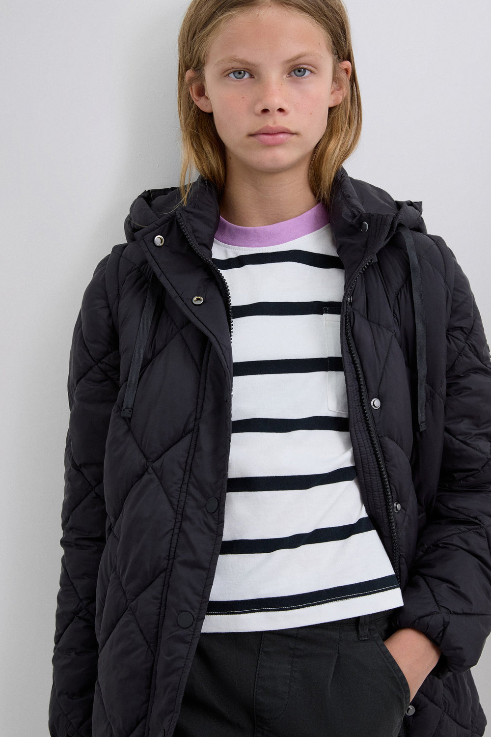 Padded coat. Detachable hood and sleeves. Front zip fastening concealed by placket with press stud fastening. Side pockets. Recycled fleece lining. Logo detail on the back.