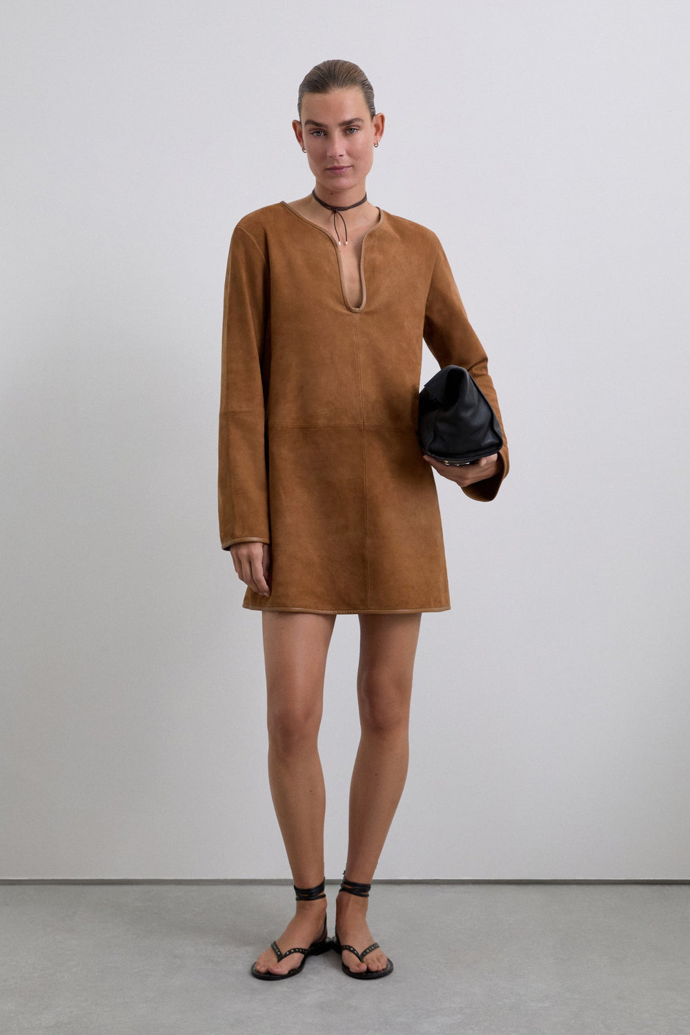 Mini dress made in goatskin with suede finish. Crew neck. Slightly flared long sleeves. Piping and stitching details around the neckline, sleeves and hem.