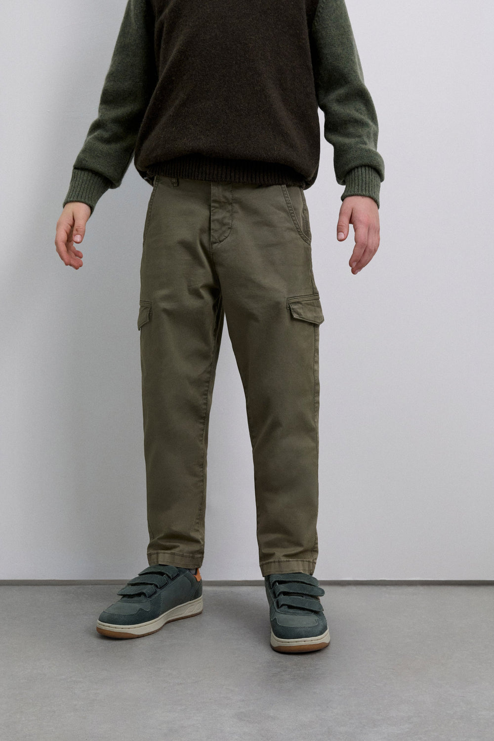 Cargo trousers made of slightly stretch BCI cotton. Regular fit, top button and zip fastening and side pockets. Belt loops at the waist and flap pockets on the leg.