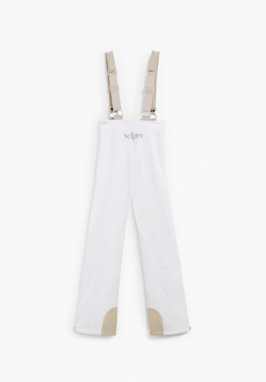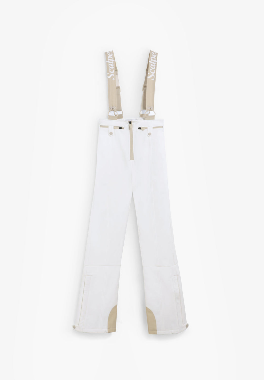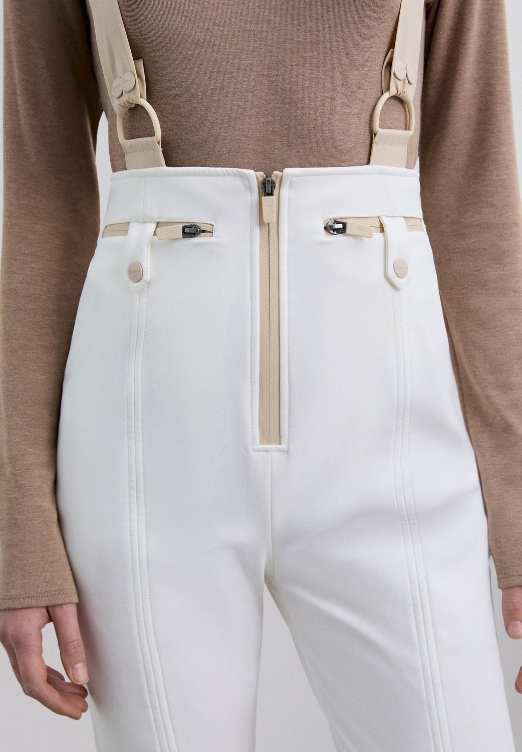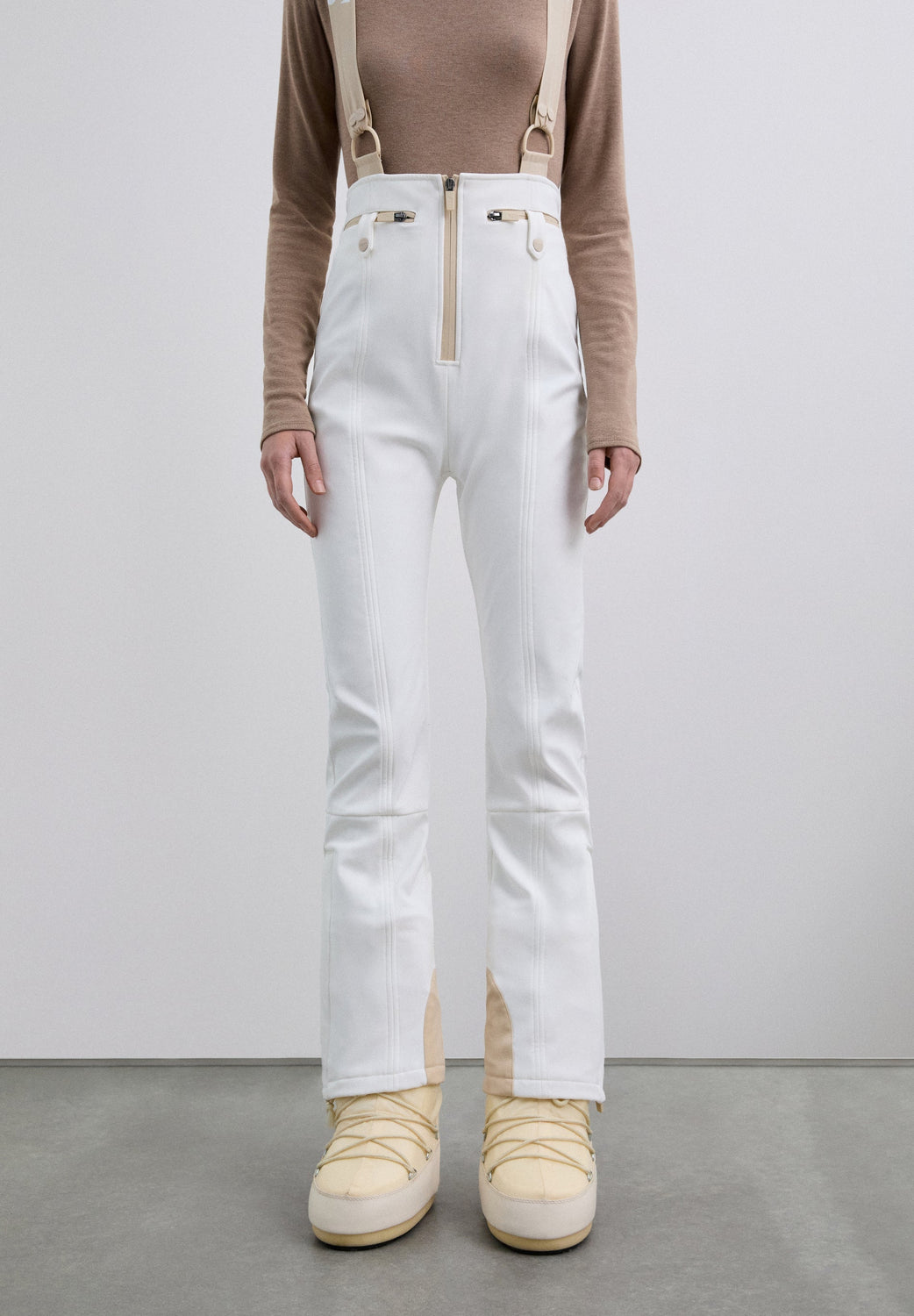 Ski trousers with braces made of technical fabric with a high waist and centre front zip fastening. The wide, adjustable straps feature logo details. They have zipped front pockets with snap fastening. Side zips on the hem and a fitted inner layer. Contrast details.