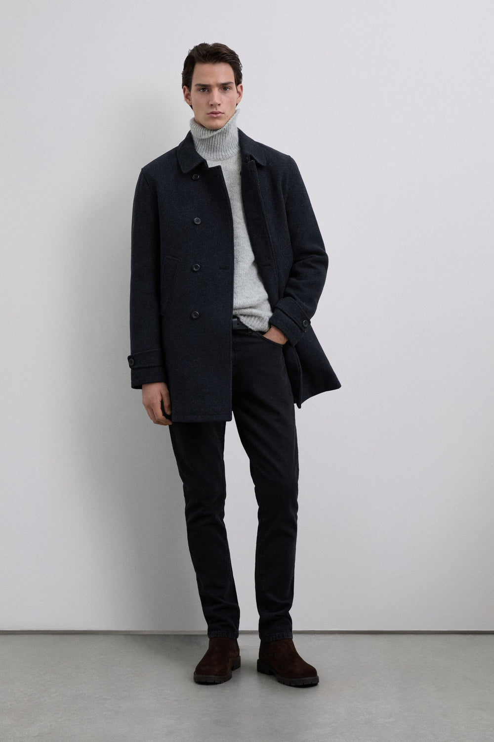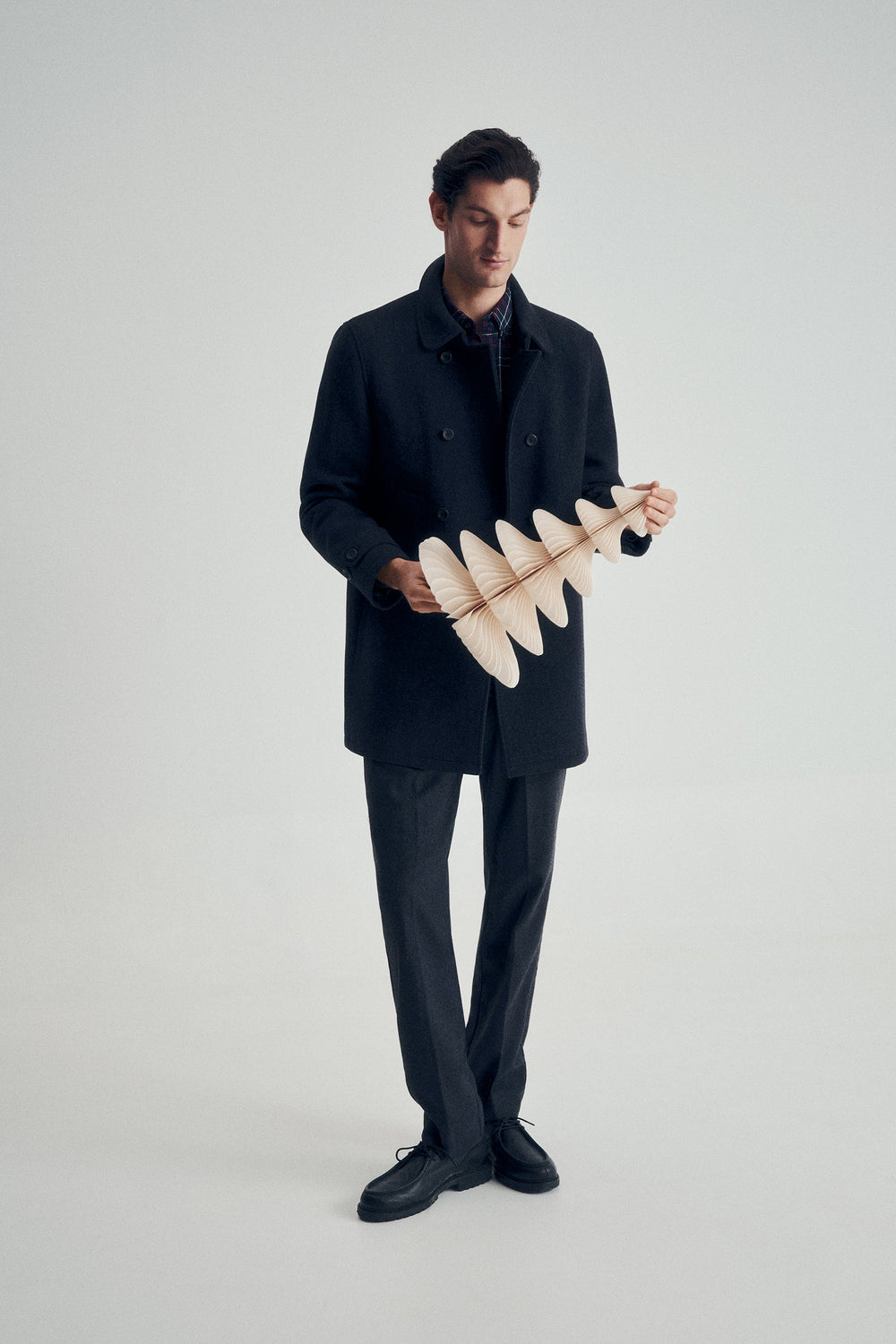 Double-breasted jas gemaakt van wolmix. Knoopsluiting aan de voorkant. Schuine paspelzakken aan de voorkant. Binnenzak. Manchetten met riemlussen.